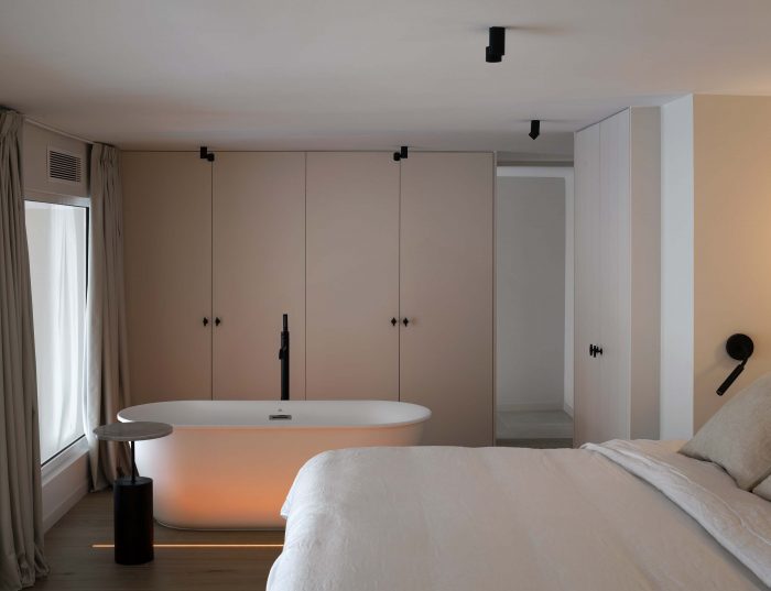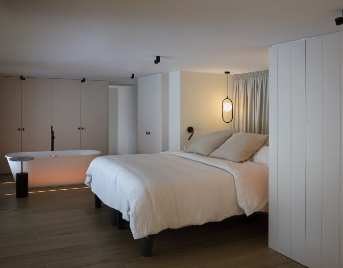Puede que por razones de la estructura de la vivienda o por que simplemente no quieres hacer agujeros en el techo, puedes optar por poner focos o proyectores de superficie. En un proyecto reciente – Gran Loft. La Manga Club de Golf – nos encontramos con un dormitorio en altillo. La escasa altura del altillo, de tan solo 2 metros, y la imposibilidad de poder empotrar la iluminación nos obligó a jugar con iluminación de superficie de dimensiones reducidas. Ten en cuenta que sean dirigibles y la distancia adecuada para abrir las puertas del armario sin que choque.