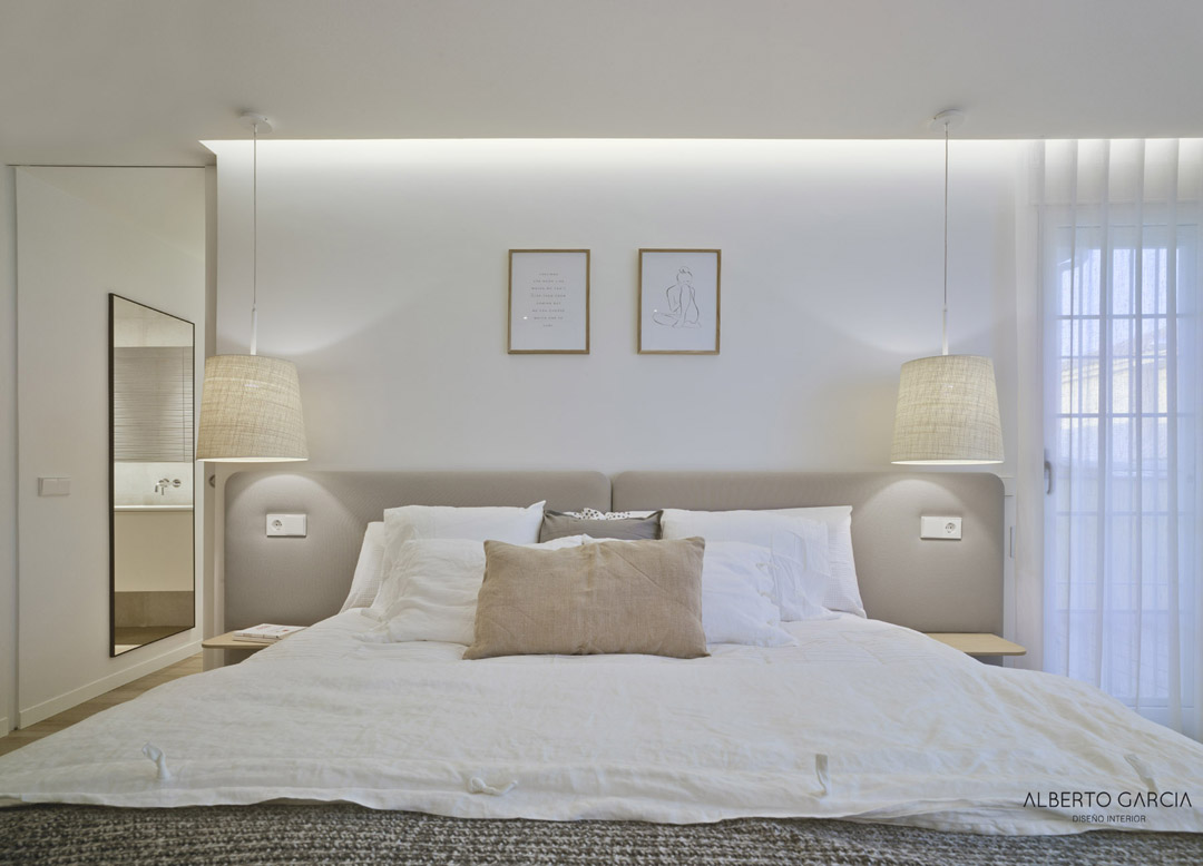 Se planteó un dormitorio amplio y con tonos neutros, adecuados para crear un ambiente adecuado para el reposo. El cabecero Lota de Treku, aporta confort y comodidad a la zona de descanso. Las lámparas suspendidas NAAF de Massmi, en rafia natural aportan una luz cálida y suave perfecta para la lectura y que invita a la relajación y a al descanso.