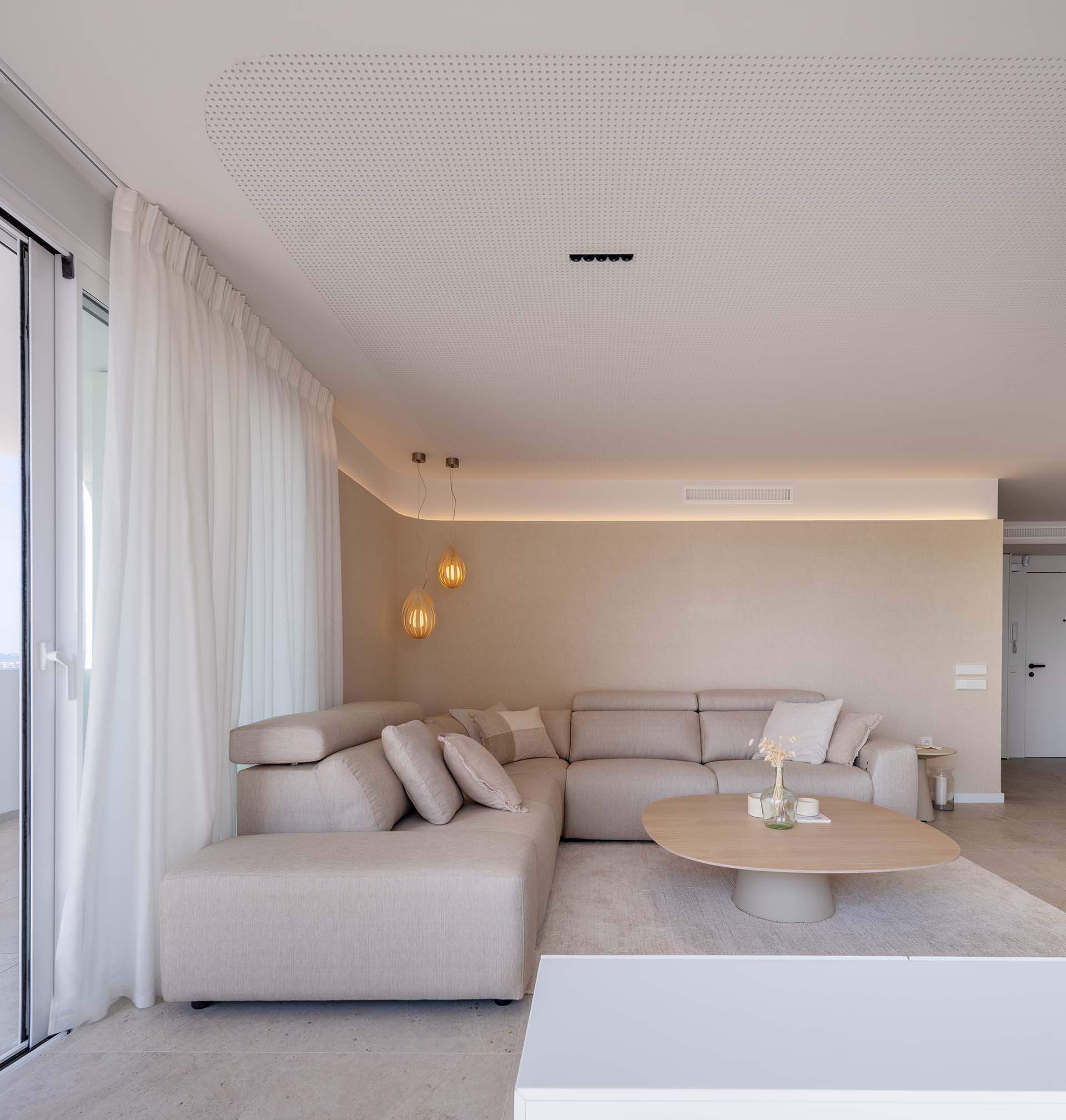 El sofá, con el módulo rinconera curvo, de la firma murciana Pedro Ortiz, está tapizado en la misma gama cromática del proyecto con los tejidos de Elastron (firma textil Murciana).
