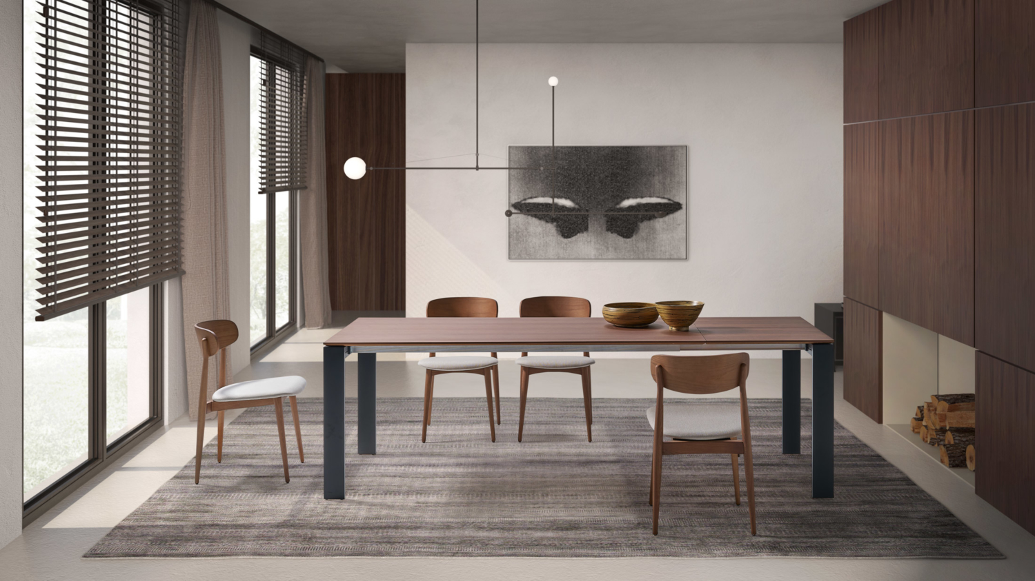 - Extensible. Encimera varias opciones: Tablero DM chapado en roble o nogal. Cristal color óptico. Porcelánico 3 mm pegado a cristal 8 mm.