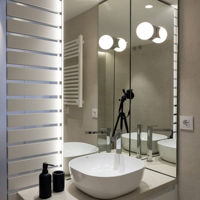 La colocación de los espejos en perpendicular crea un efecto óptico de profundidad además de incluir el aplique «Lago» y la iluminación lateral indirecta.