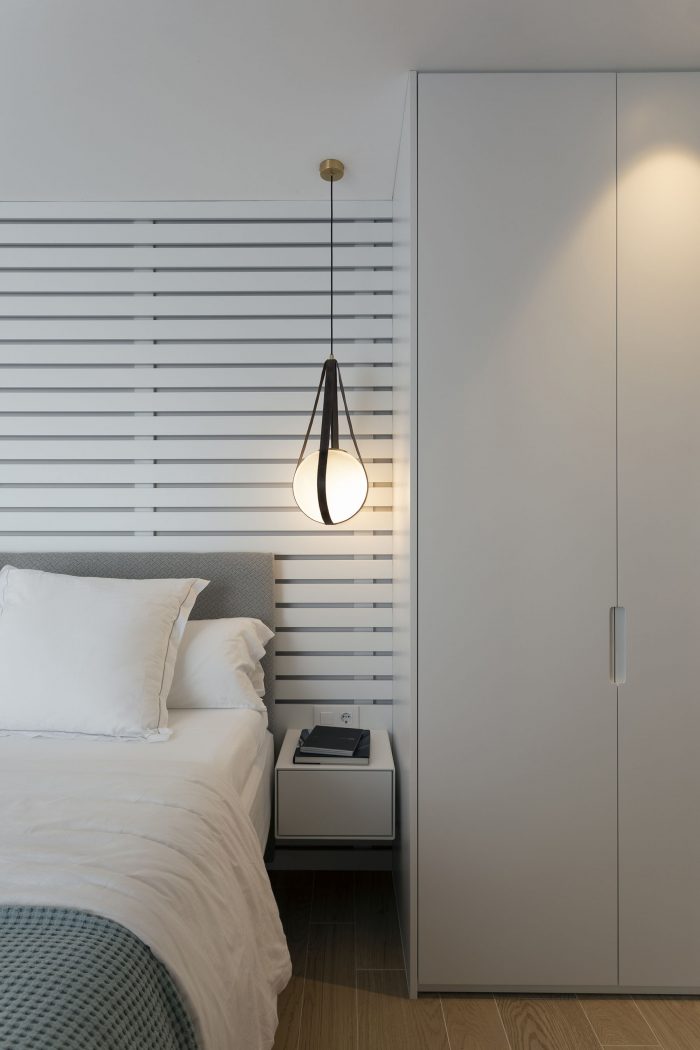 Para el cabecero se utilizaron listones de madera lacados a modo de celosía con cierto aire marino. Este mismo acabado lacado es utilizado para el armario y la sutil mesita de noche fabricada también a medida.