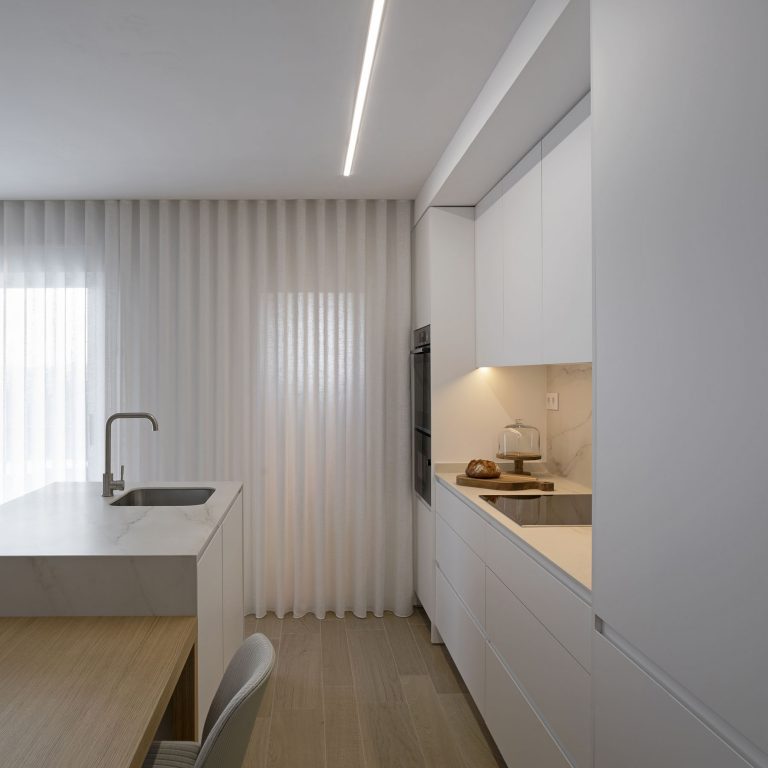 Con una intervención mínima en la tabiquería, conseguimos hacer una distribución de mobiliario que cubra todas las necesidades y conseguir un diseño fresco y ordenado con una superficie útil de tan solo 75m2.