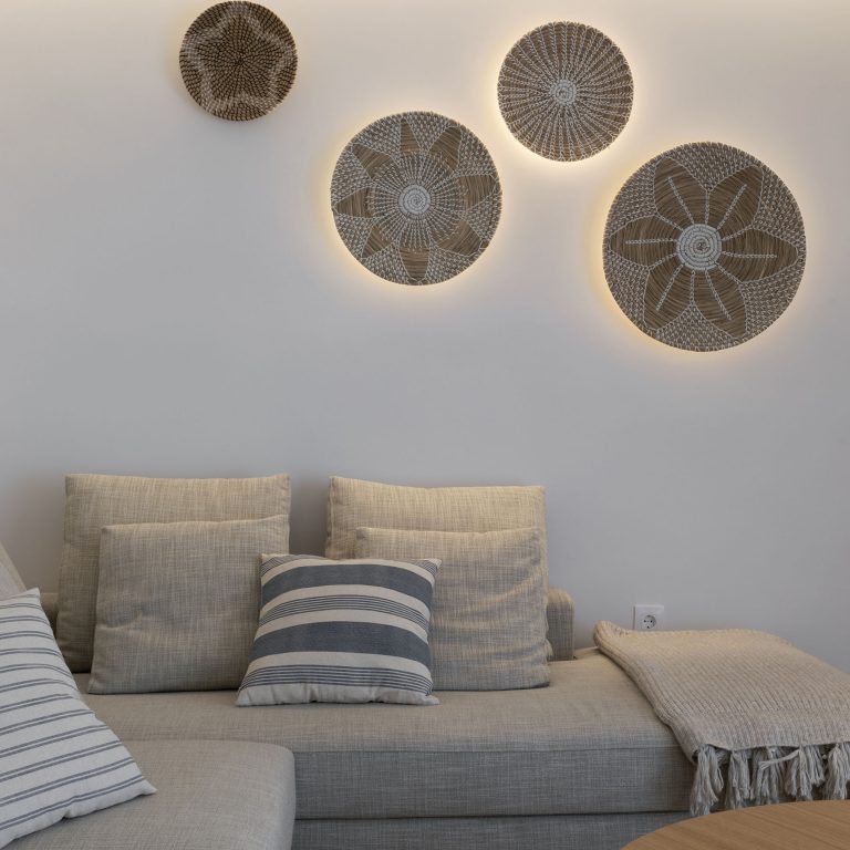 Destacamos la selección tanto de mobiliario como de iluminación decorativa y una paleta de materiales lo más reducida posible dejando el protagonismo al hermoso entorno natural con vistas al mediterráneo.