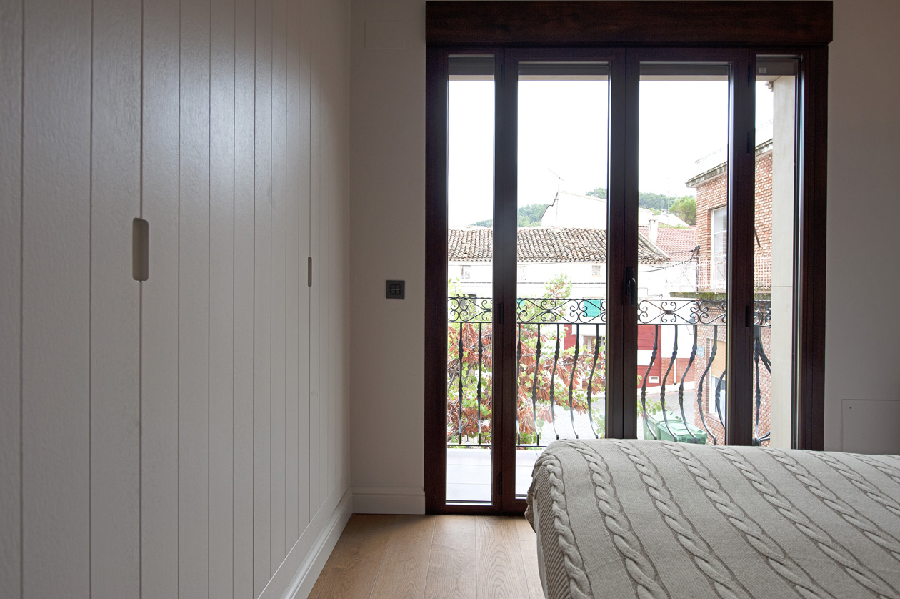 El dormitorio principal mantiene la misma intención: textiles suaves, mobiliario sencillo y un ambiente calmado pensado para el descanso.