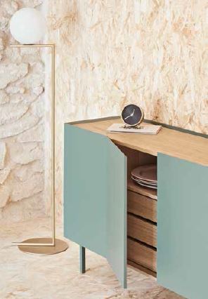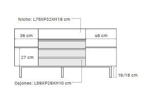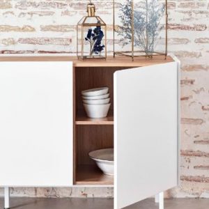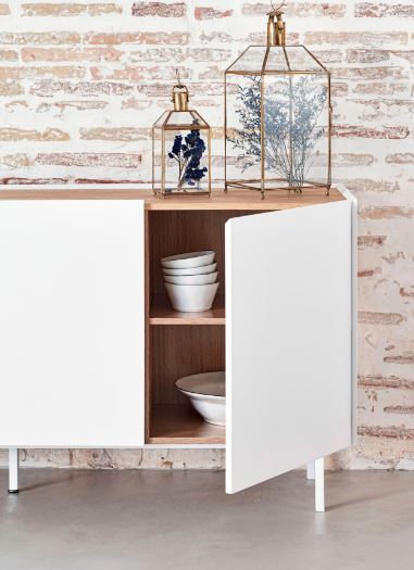 Aparador Arista. El aparador Arista consta de cuatro puertas tras las que encontramos en su interior dos baldas y tres cajones, ofreciendo un amplio espacio de almacenamiento.