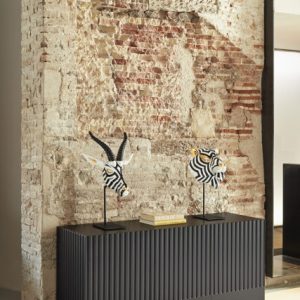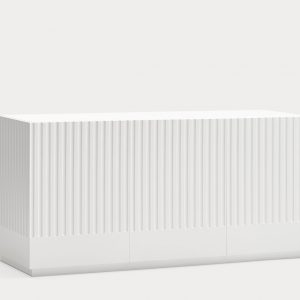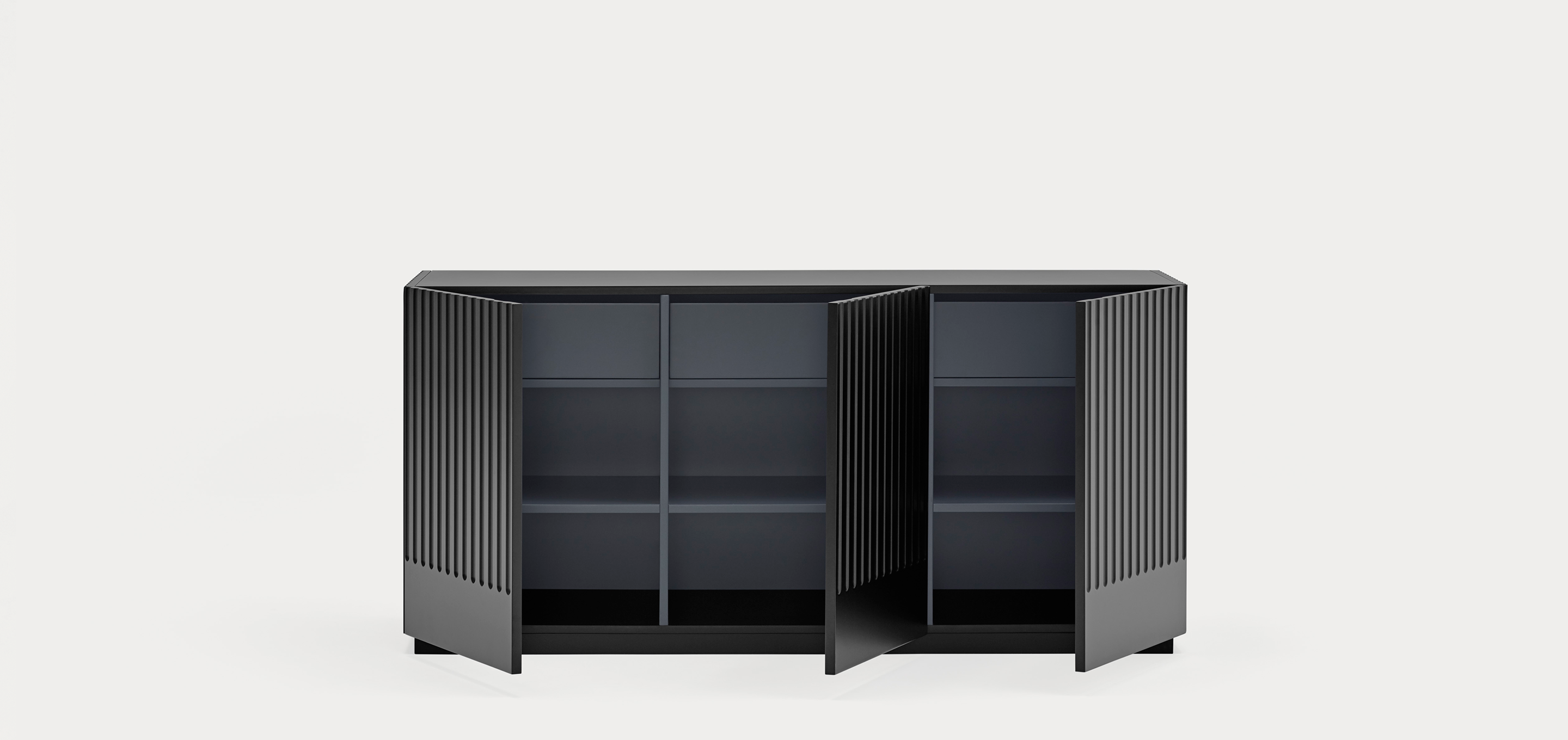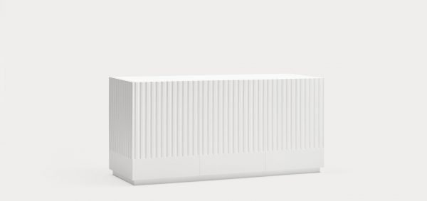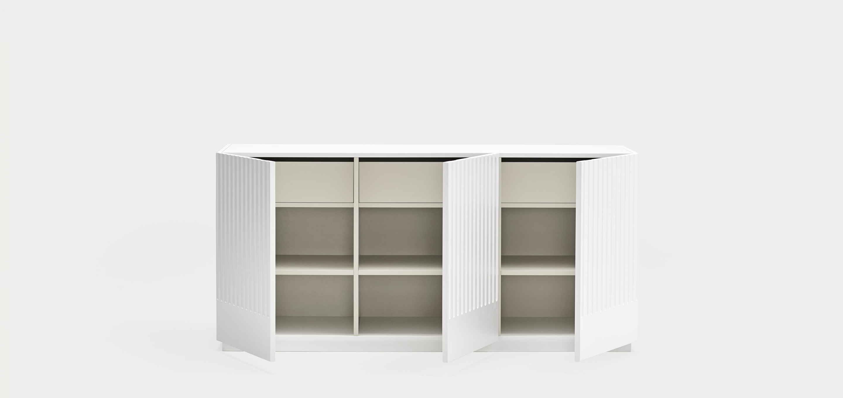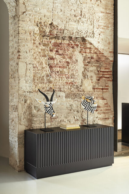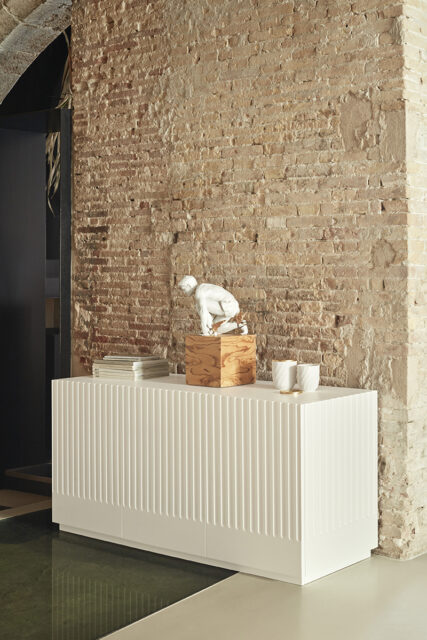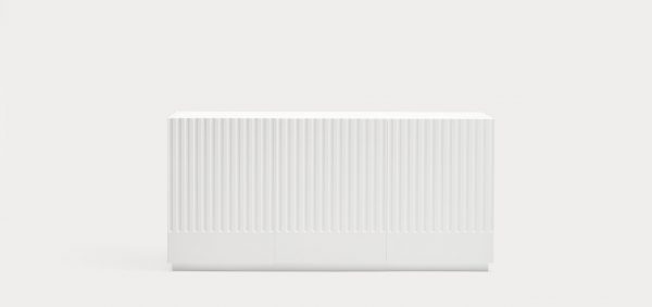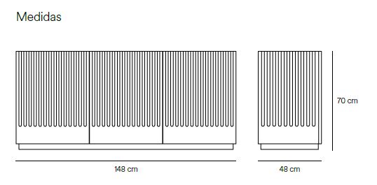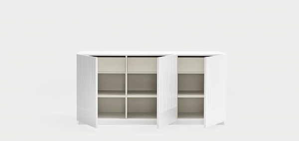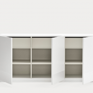 Aparador Doric II. El aparador Doric es grande, robusto y con unas líneas que nos recuerdan a la arquitectura de la Grecia clásica. Los surcos verticales y su gran presencia nos recuerda como estos clásicos buscaban la belleza y la proporcionalidad en sus obras. Es una gran aparador de casi dos metros de ancho que consta de 3 puertas con 3 cajones y 6 huecos. Gracias a su gran capacidad de almacenaje lo hace perfecto para guardar de forma ordenada y visible todo tipo de objetos.