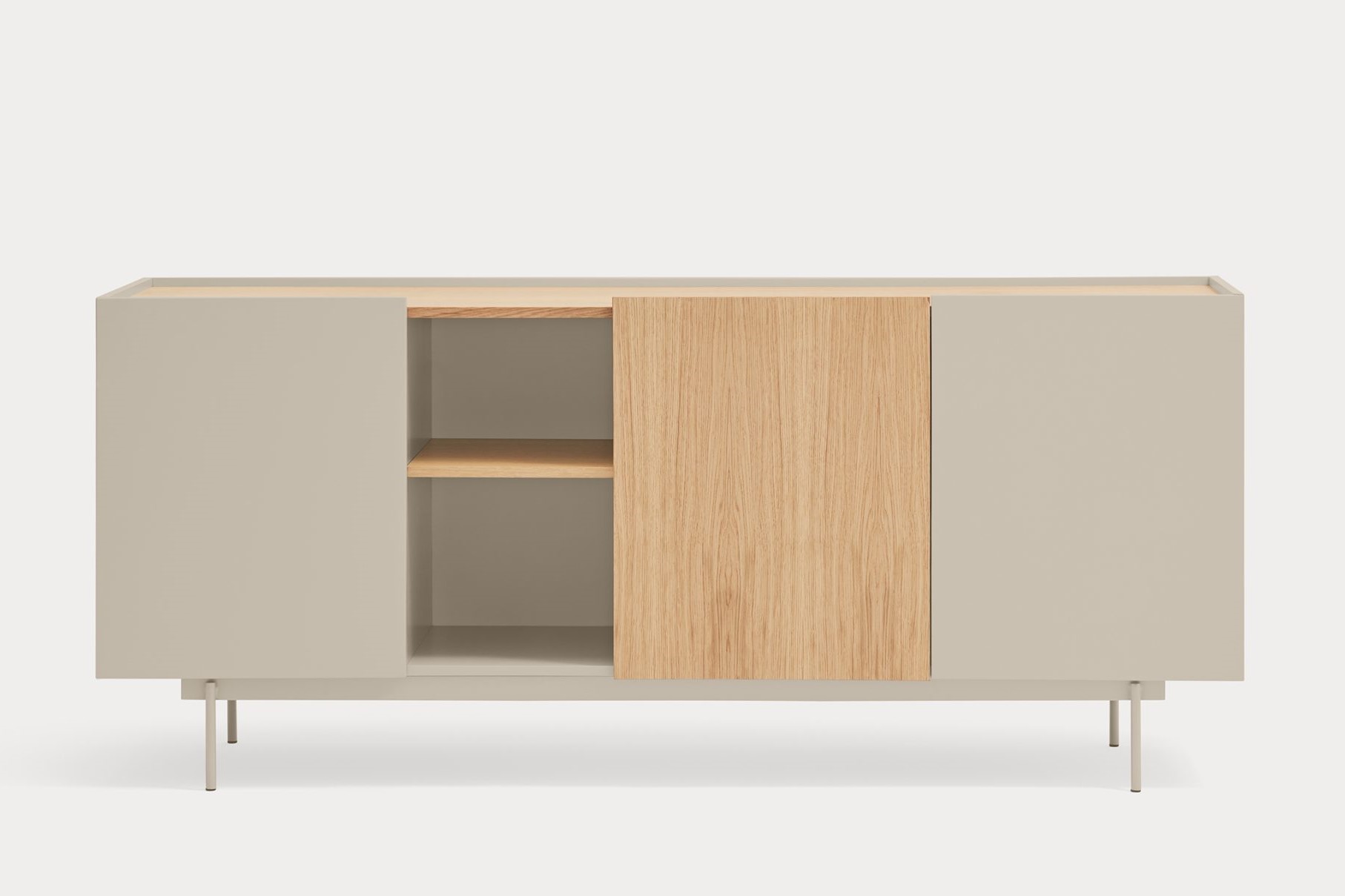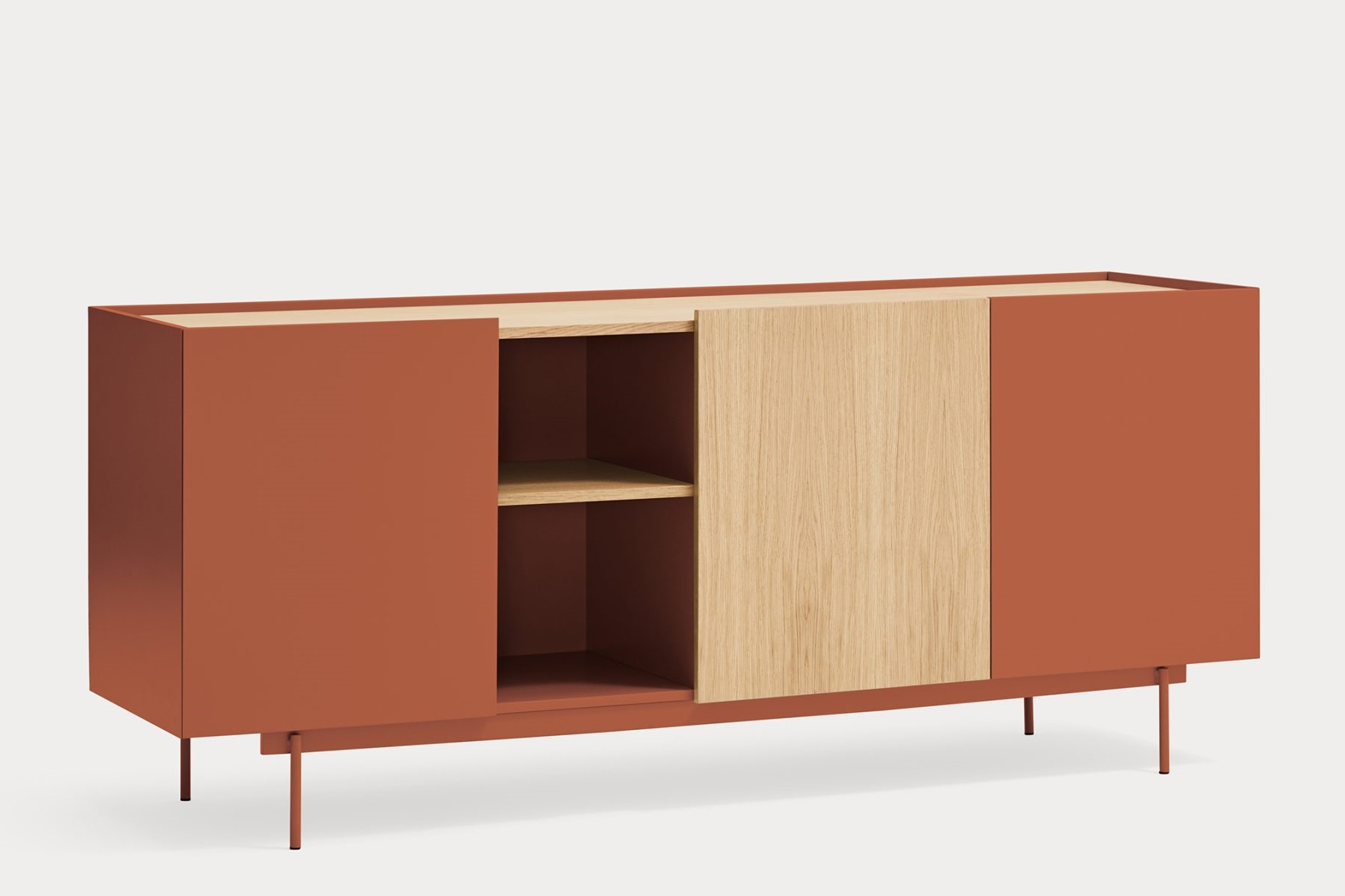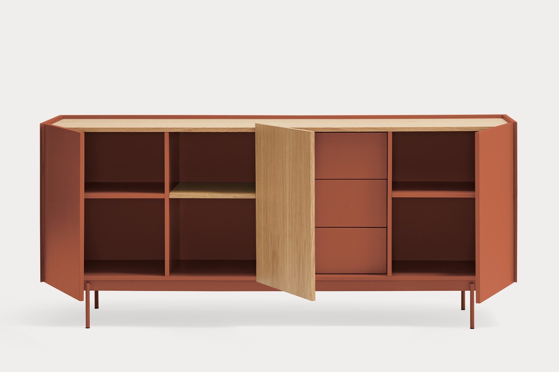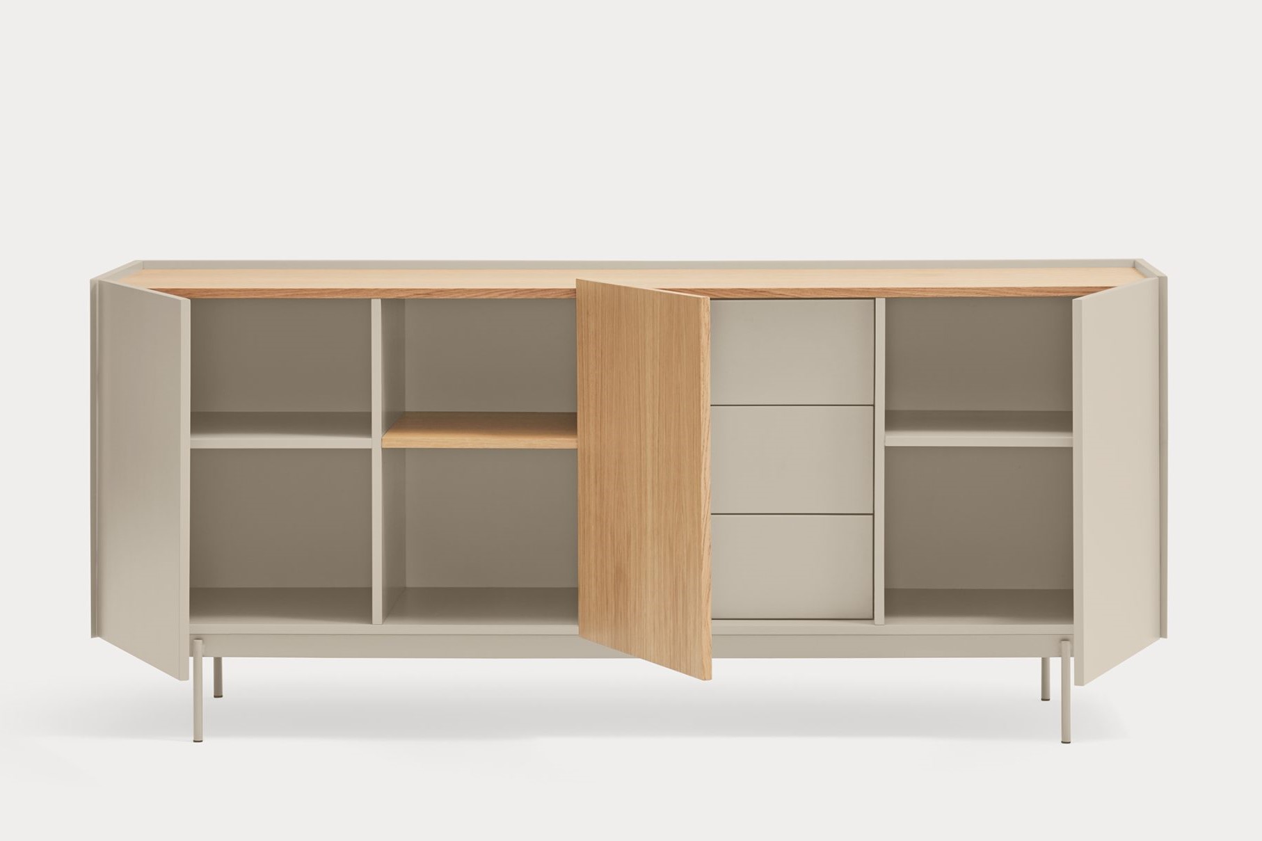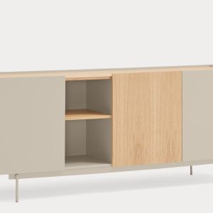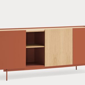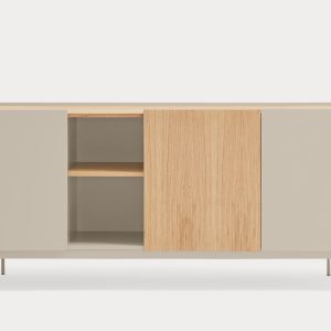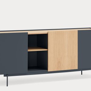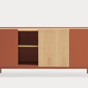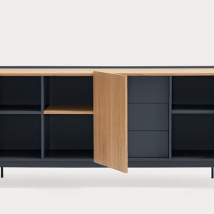 Aparador Otto II. Otto se distingue por un estilo moderno de líneas limpias, en el cual el color se combina con acentos en chapa natural, permitiéndole adaptarse a una amplia variedad de espacios. Su diseño incorpora diversas configuraciones de almacenaje, otorgándole una mayor versatilidad y aportando ritmo y dinamismo a su estructura. Otto tiene un diseño versátil tanto en estilo como en funcionalidad. El aparador Otto II dispone de 3 puertas lacadas y de roble. Una de ellas esconde 3 cajones y y las otras dos 6 nichos que permiten organizar y ordenar todos nuestros objetos de una manera cómoda y eficaz.