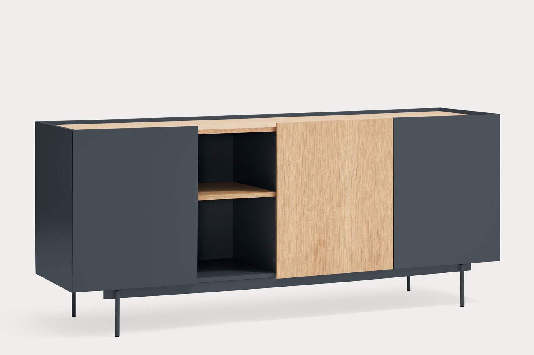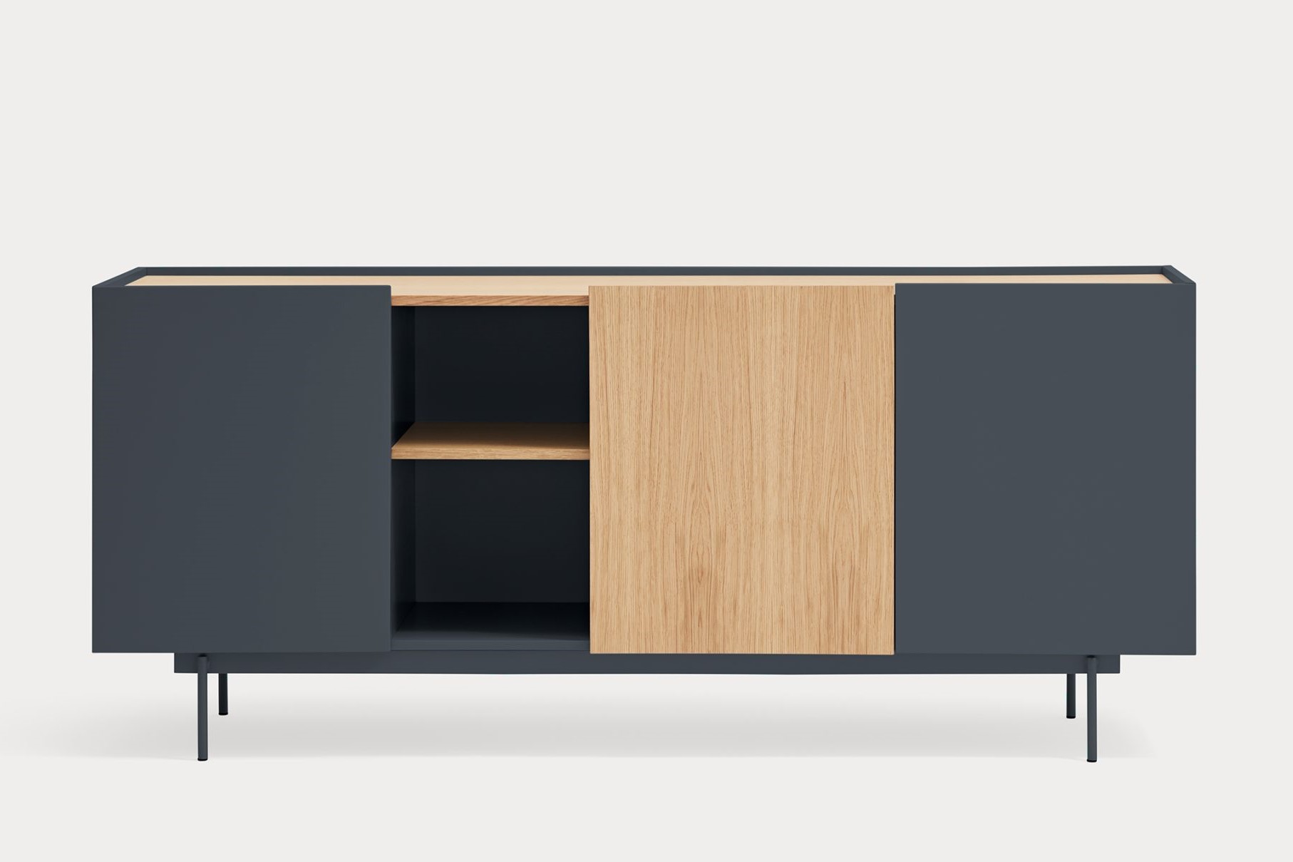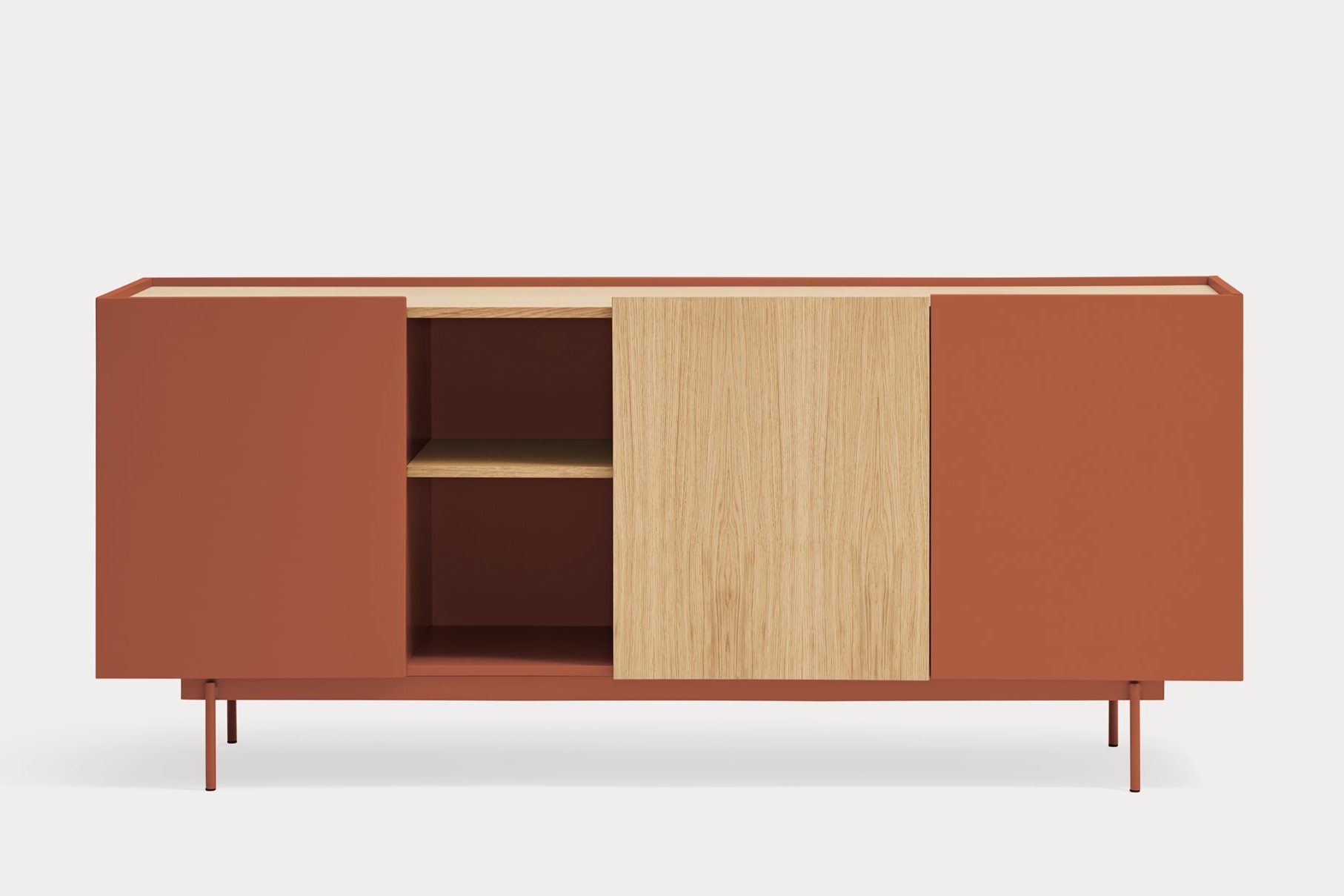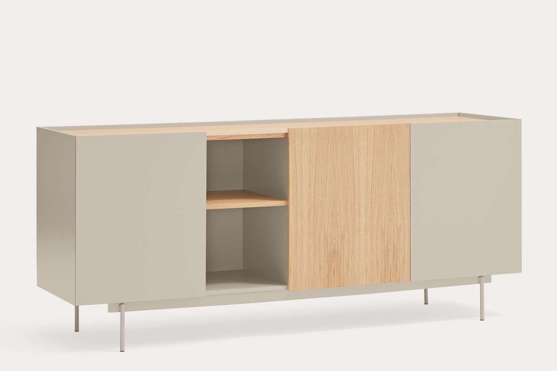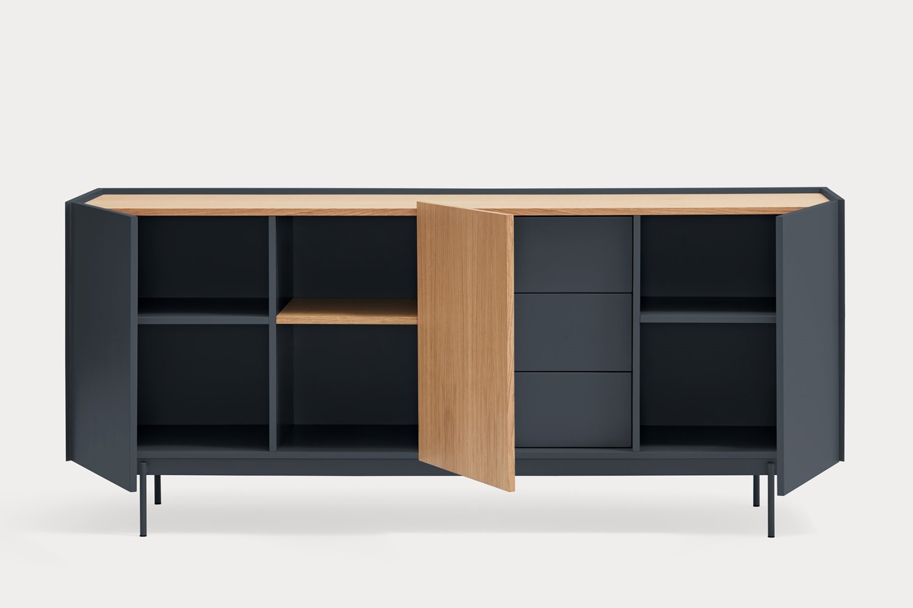 Aparador Otto II. Otto se distingue por un estilo moderno de líneas limpias, en el cual el color se combina con acentos en chapa natural, permitiéndole adaptarse a una amplia variedad de espacios. Su diseño incorpora diversas configuraciones de almacenaje, otorgándole una mayor versatilidad y aportando ritmo y dinamismo a su estructura. Otto tiene un diseño versátil tanto en estilo como en funcionalidad. El aparador Otto II dispone de 3 puertas lacadas y de roble. Una de ellas esconde 3 cajones y y las otras dos 6 nichos que permiten organizar y ordenar todos nuestros objetos de una manera cómoda y eficaz.