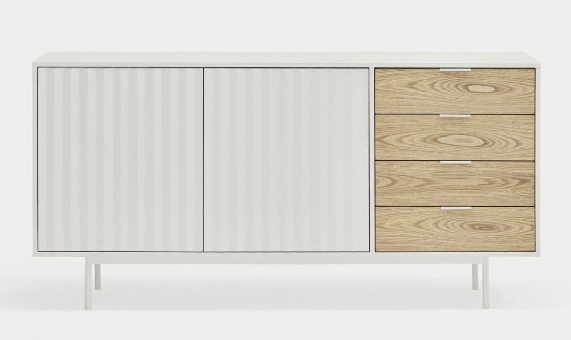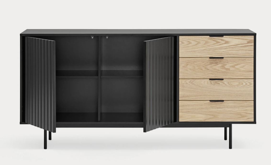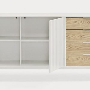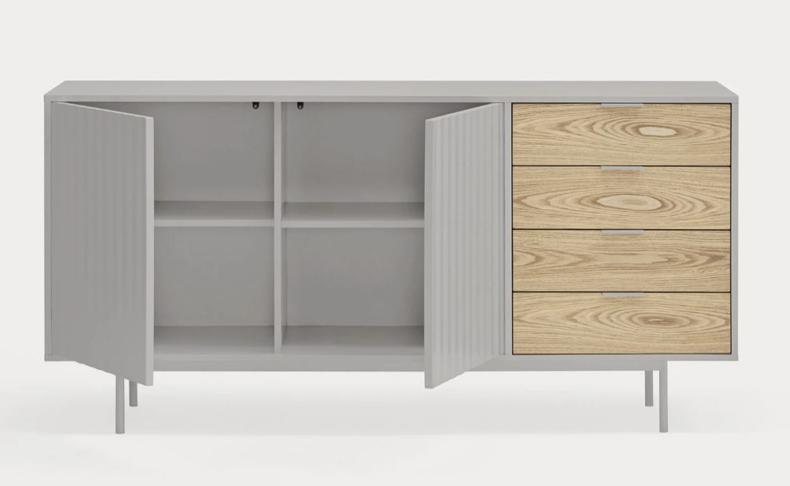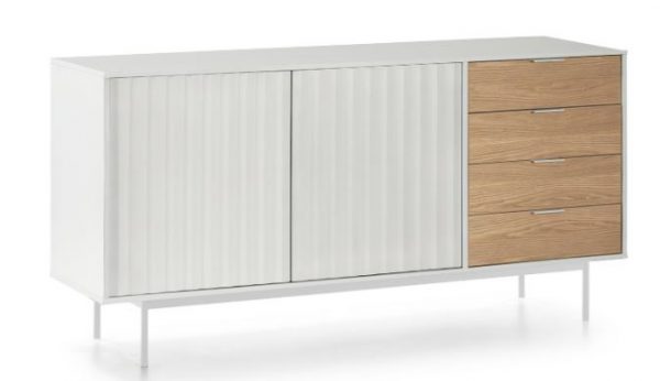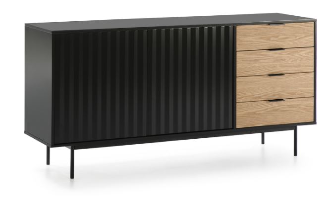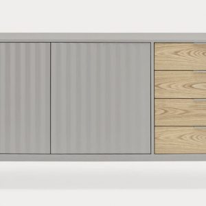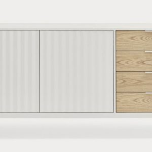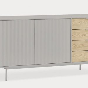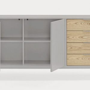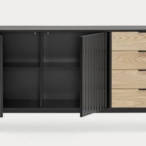 Aparador Sierra II. El aparador Sierra tiene dos puertas con la trama singular de esta serie y cuatro cajones. En el interior dos baldas complementan el espacio resultante.