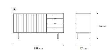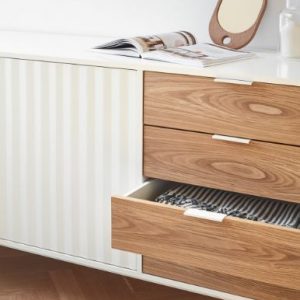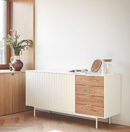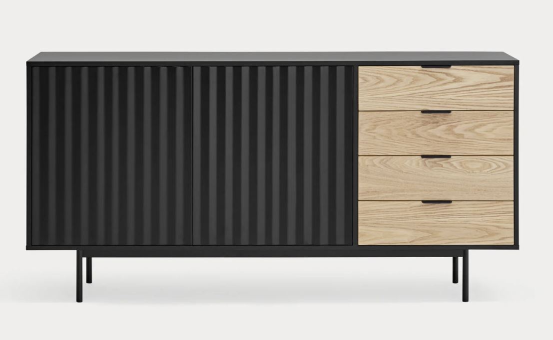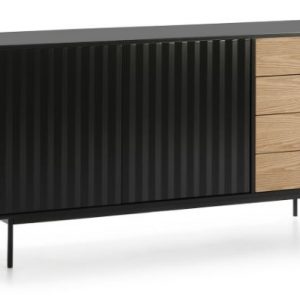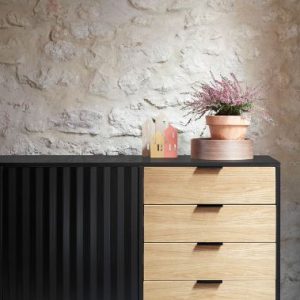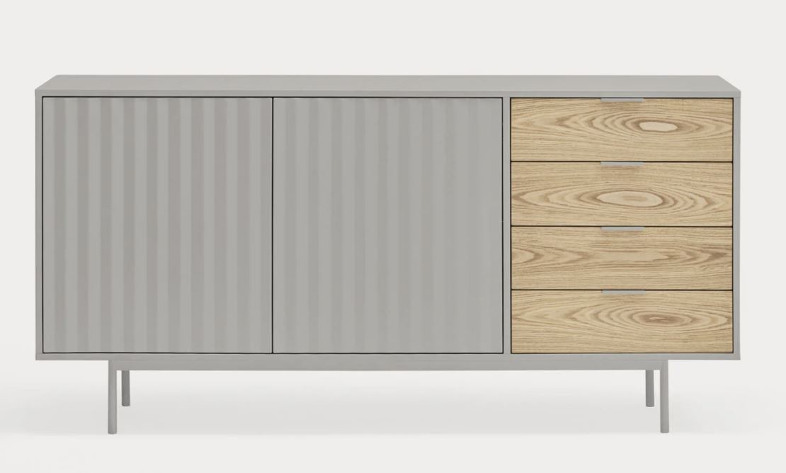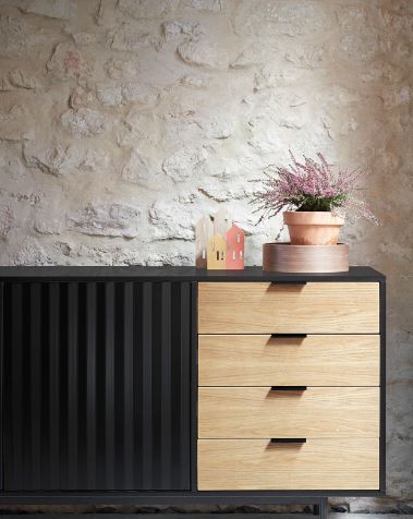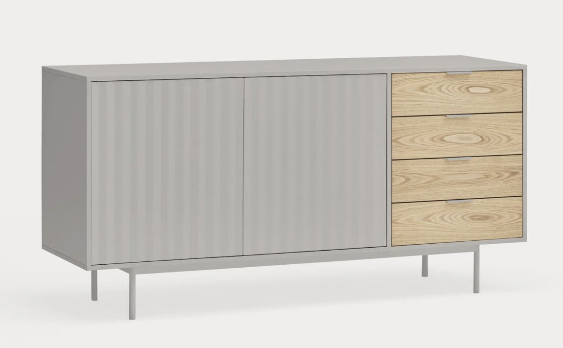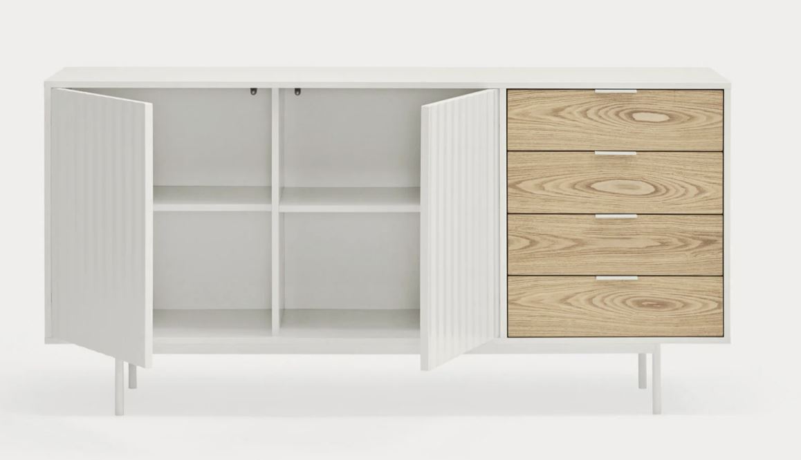 Aparador Sierra II. El aparador Sierra tiene dos puertas con la trama singular de esta serie y cuatro cajones. En el interior dos baldas complementan el espacio resultante.