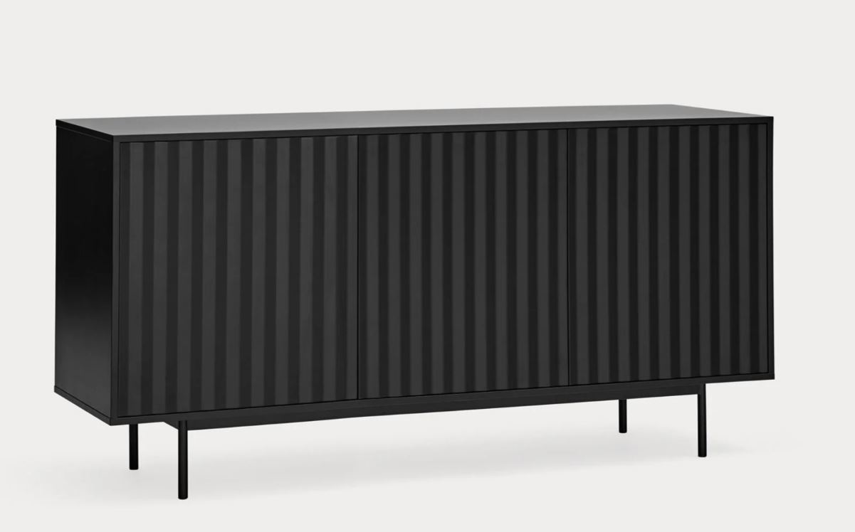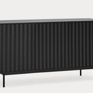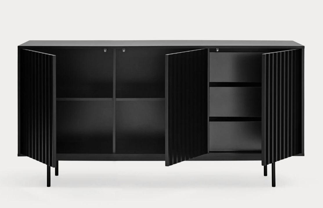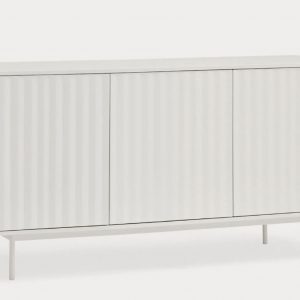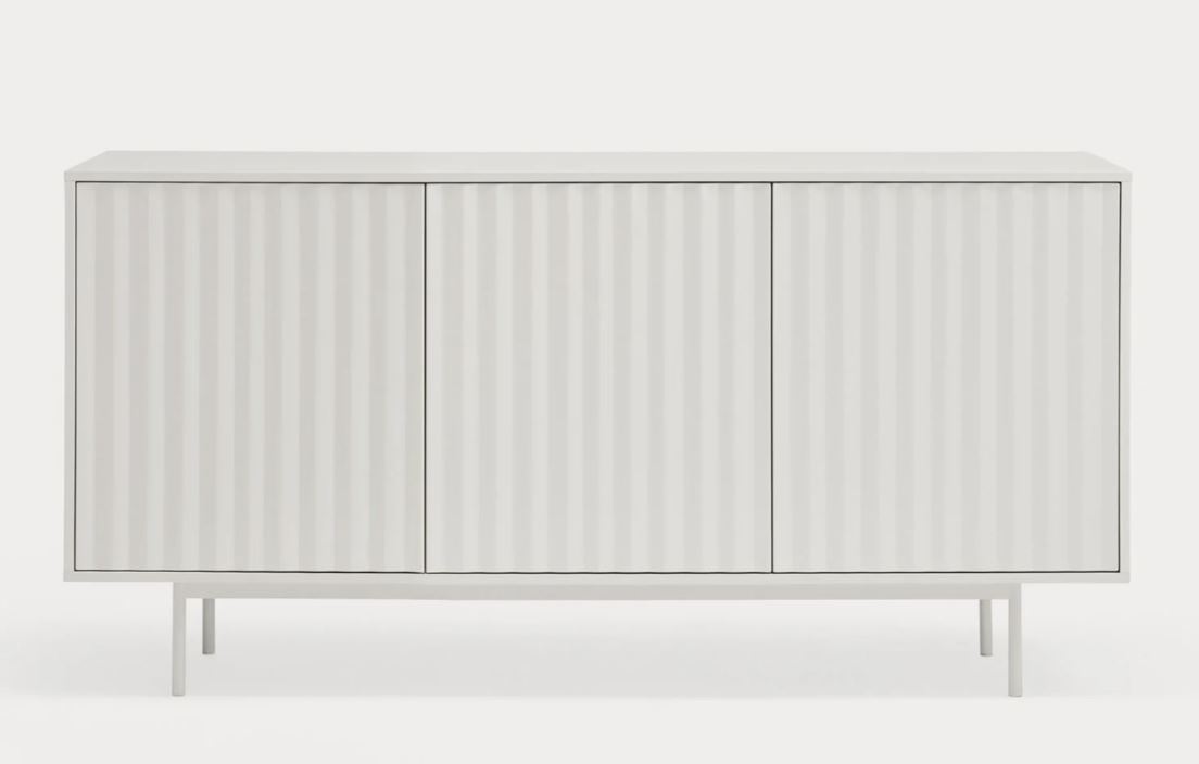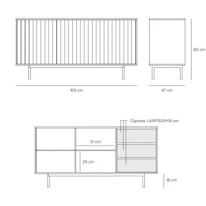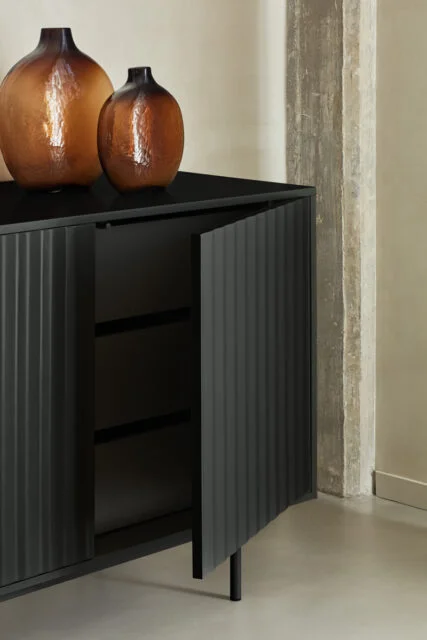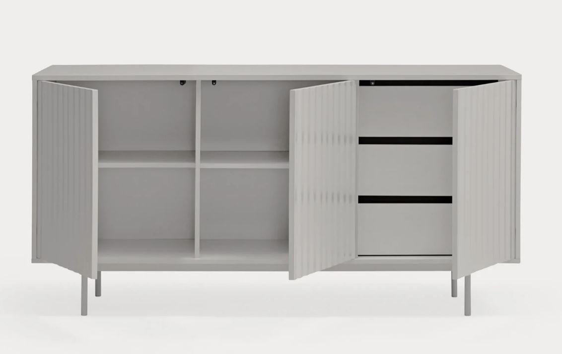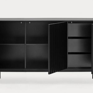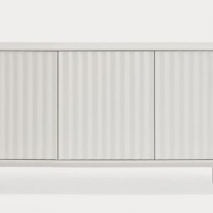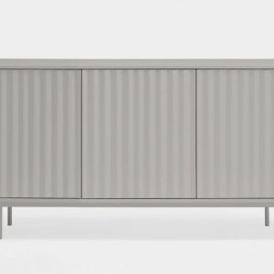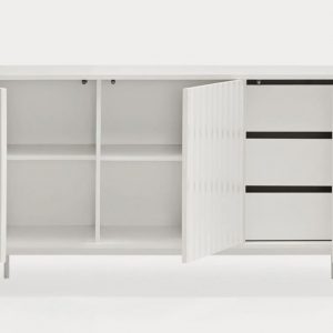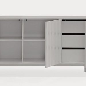 Aparador Sierra III. El aparador Sierra tiene tres puertas con la trama singular de esta serie. Dos de sus puertas acceden a baldas amplias y su tercera puerta nos ofrece 3 cajones para múltiples usos, proporcionando un amplio espacio de almacenamiento.