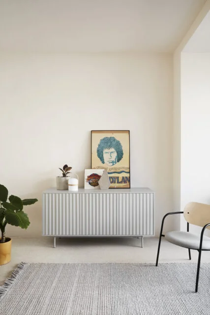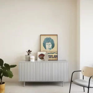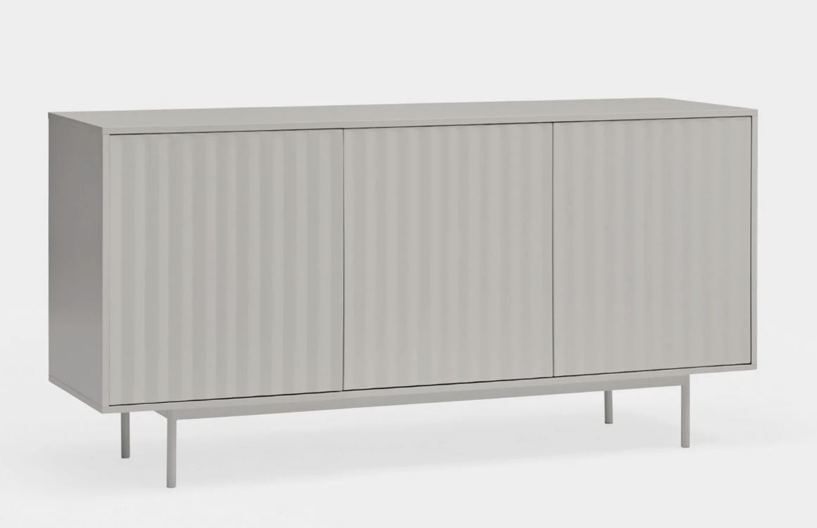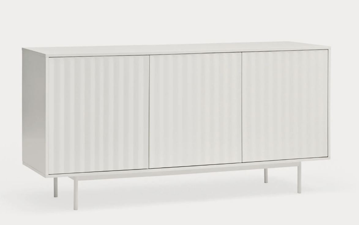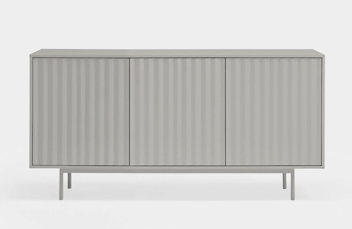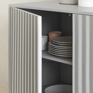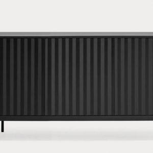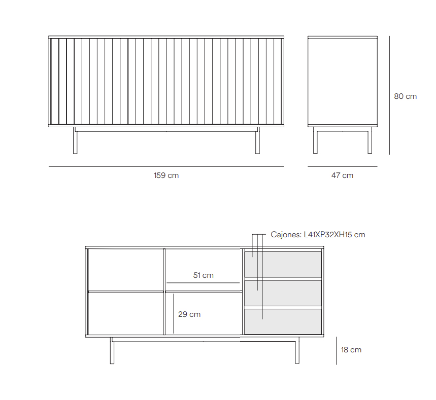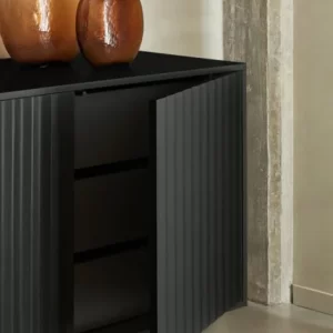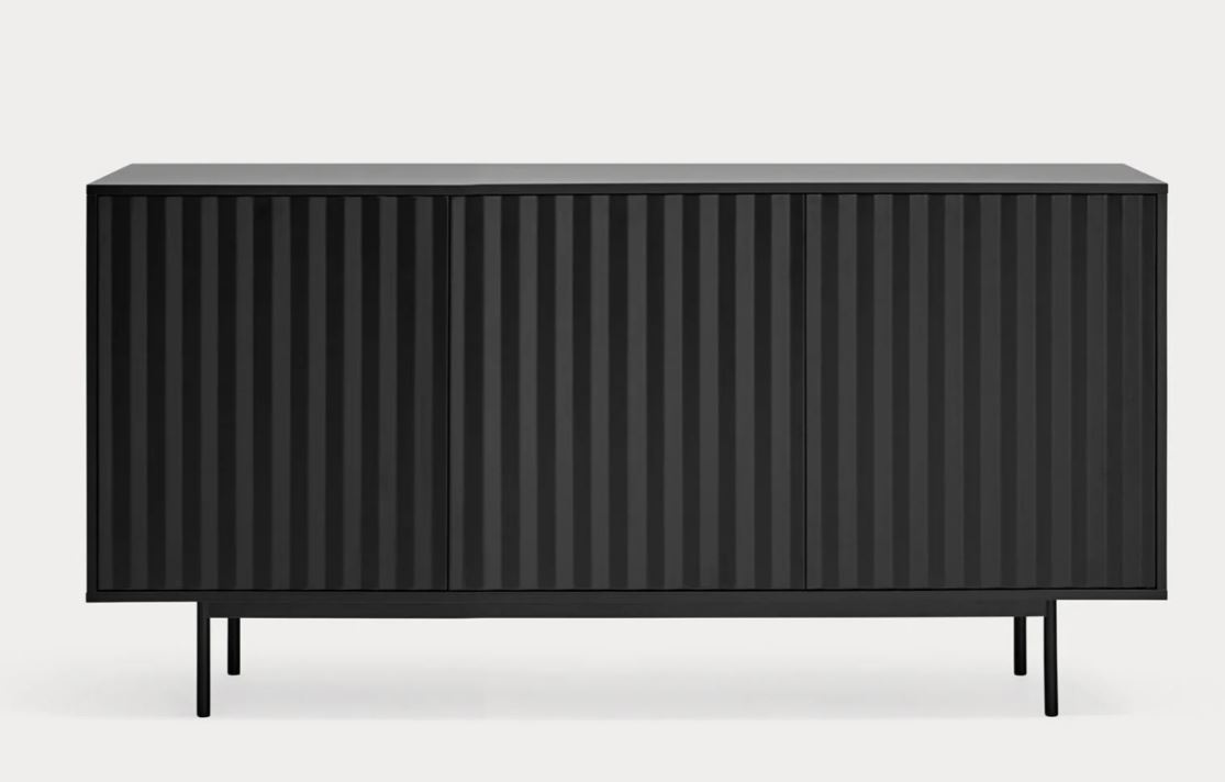 Aparador Sierra III. El aparador Sierra tiene tres puertas con la trama singular de esta serie. Dos de sus puertas acceden a baldas amplias y su tercera puerta nos ofrece 3 cajones para múltiples usos, proporcionando un amplio espacio de almacenamiento.