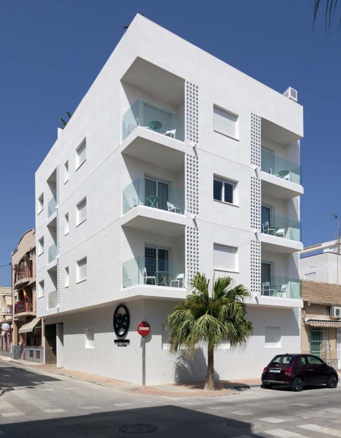 Celosía Estartit, de cerámicas Ferrer, esmaltado en blanco. Utilizadas también en la fachada del edificio.