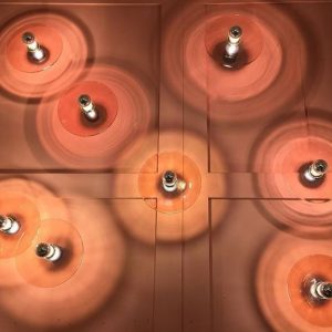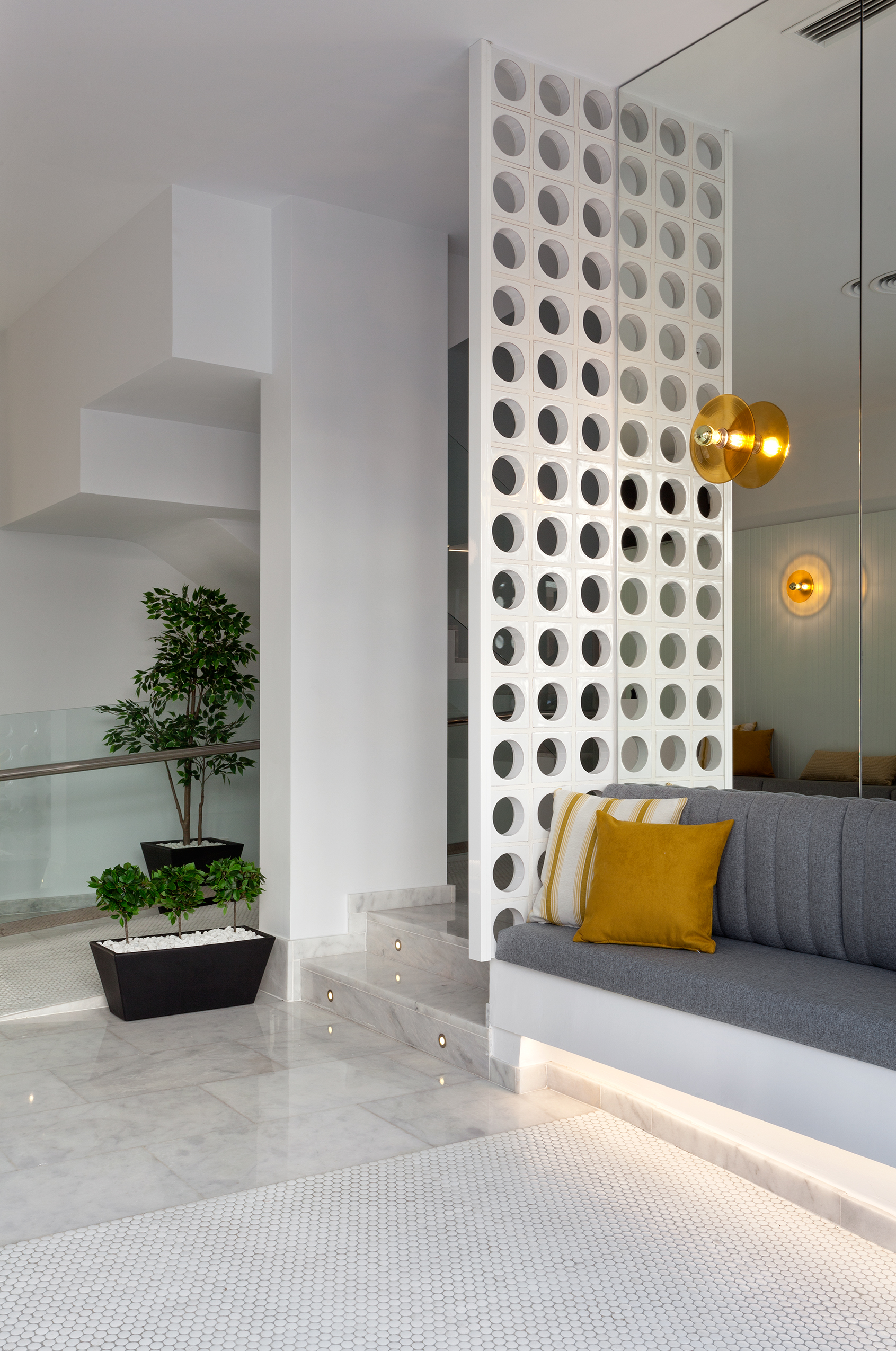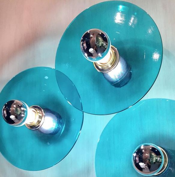Este aplique lo utilizamos para uno de nuestros proyectos favoritos. En la entrada de unos apartamentos turísticos los ubicamos como iluminación decorativa sobre un gran espejo, creando un juego de luces sorprendente. En este caso utilizamos el cristal ámbar en combinación con los textiles utilizados en las bancadas.
