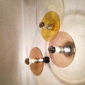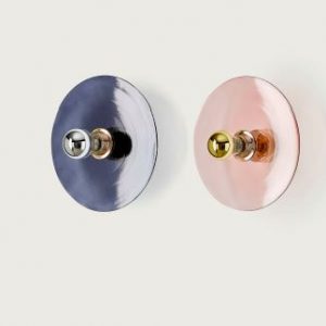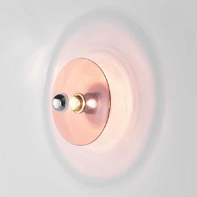 Aplique de pared Fest. El aplique Fest se trata de un aplique circular fabricando en cristal (ámbar, rosa, azul oscuro, turquesa o marrón) con accesorio de acero disponible en oro, cromo, blanco o negro.