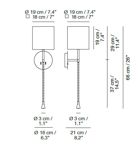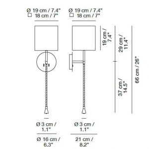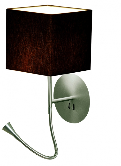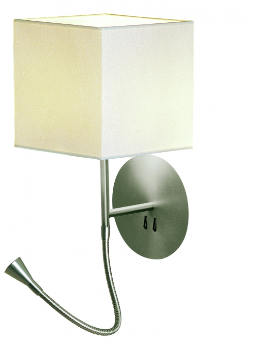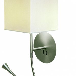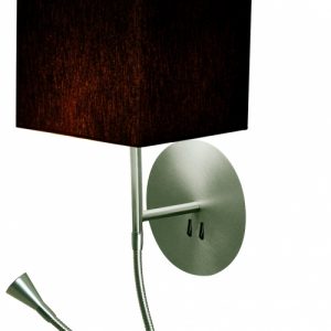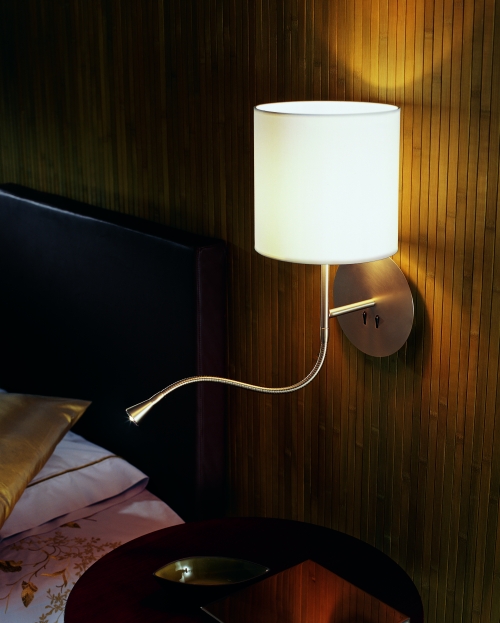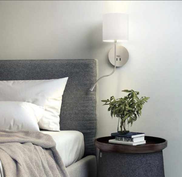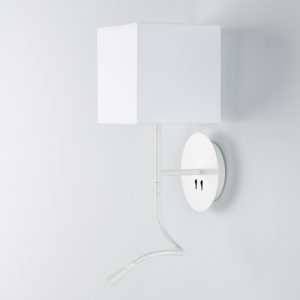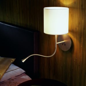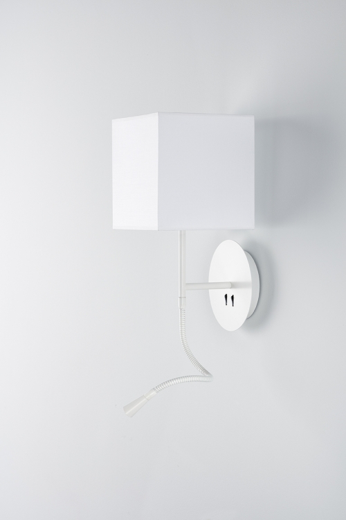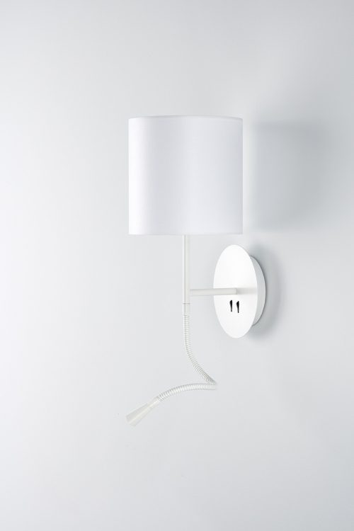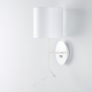 Aplique de pared Hotel Python. Se trata de un aplique metálico con pantalla en algodón y de fácil encendido gracias a sus interruptores en la base.