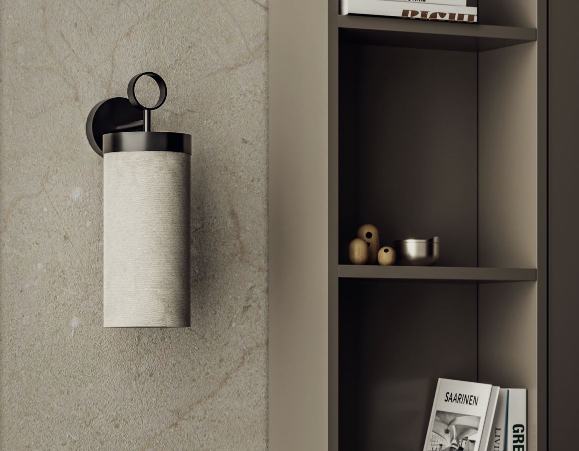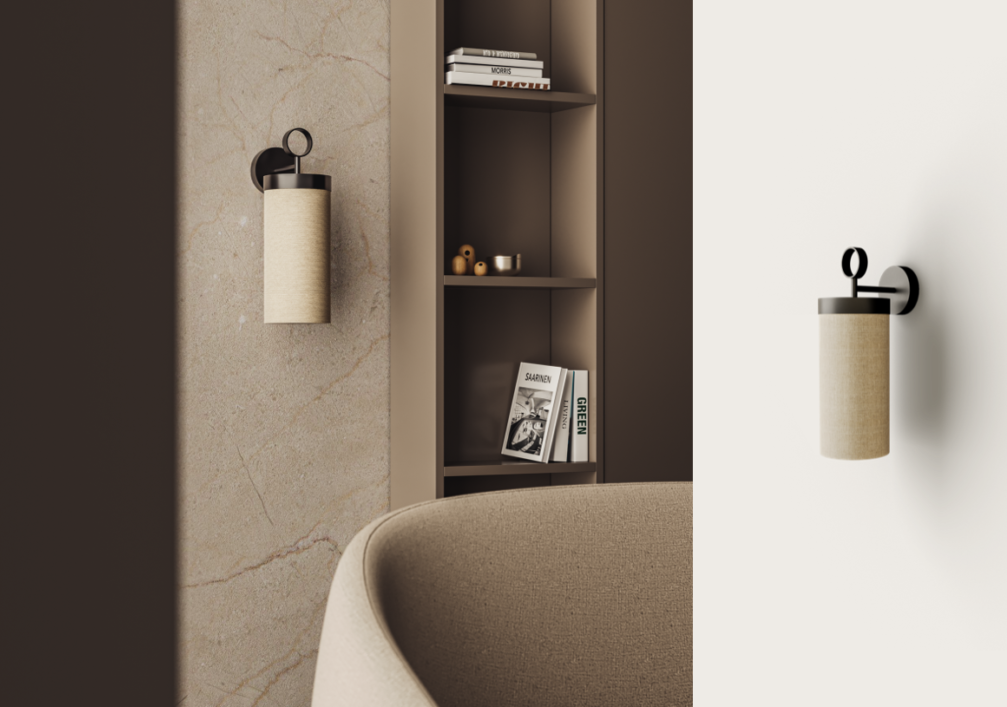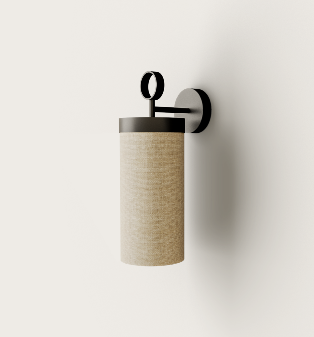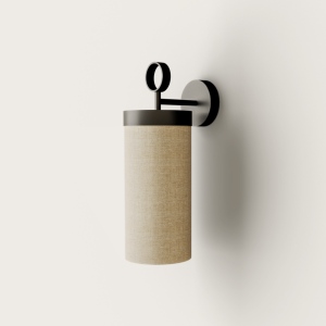 Aplique de pared Nooi. El aplique de pared Nooi posee unos aires orientales. Una pantalla de lino crema cilíndrica sobre un soporte fino de metal negro mate. Gracias a su pantalla de lino y a la calidez de su iluminación proyecta una luz ambiental muy agradable y tenue, suavizando cualquier ambiente.