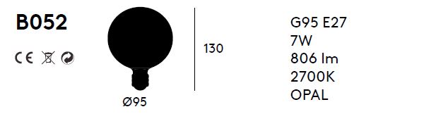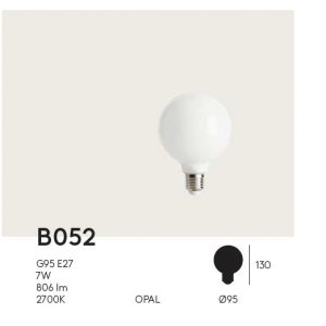 Bombilla decorativa B052. Bombilla decorativa de tamaño generoso, de cristal opal y temperatura cálida.