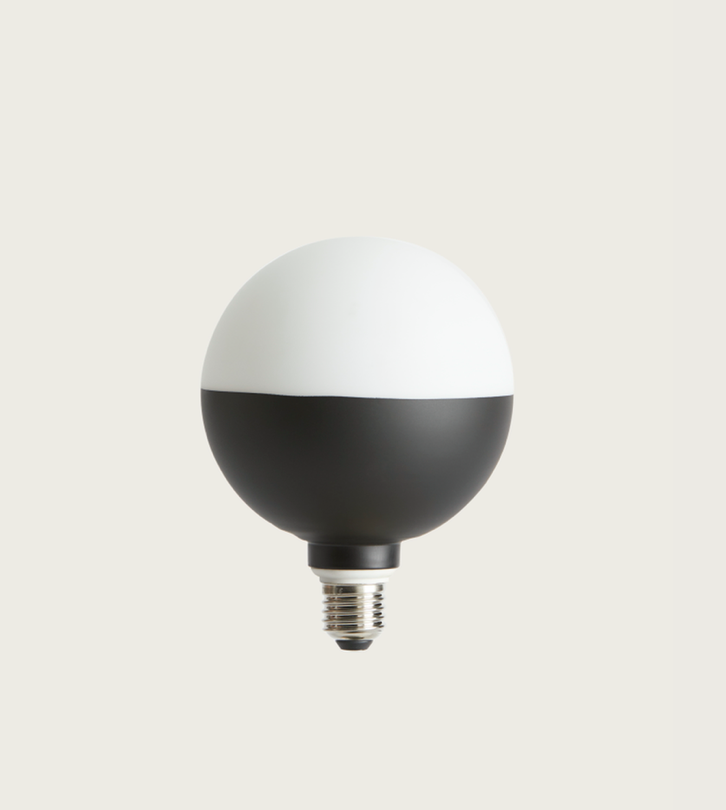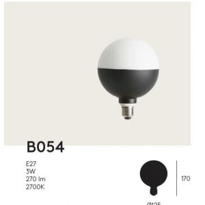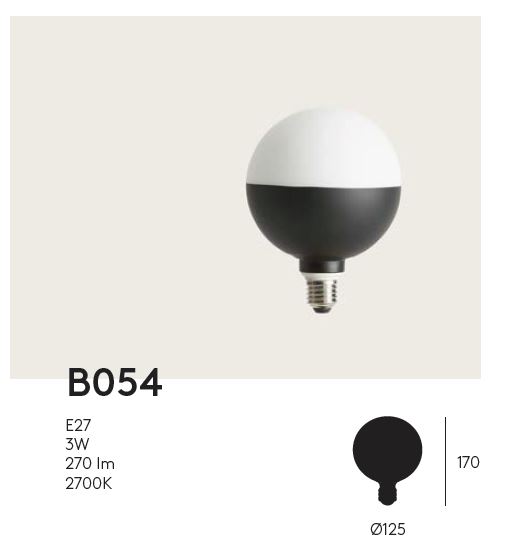 Bombilla decorativa B054. La bombilla decorativa B054, de Aromas del Campo, al igual que su compañera la B053, es una bombilla muy original. Dividida en dos franjas, blanca y negra, emite la luz de una manera muy peculiar. Su parte blanca o de cristal opal es por donde la luz se proyecta.
