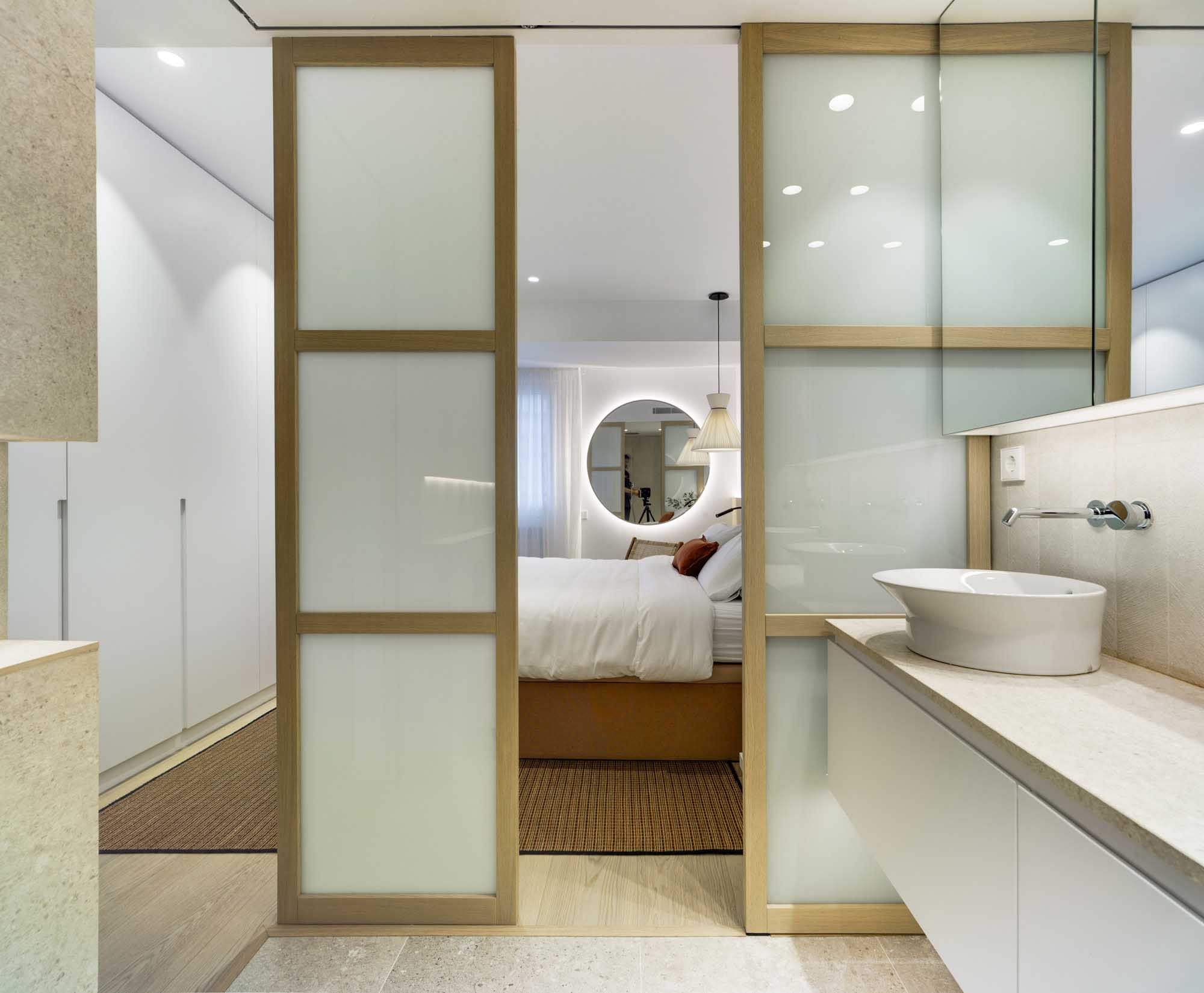 La característica más agradecida de este sistema corredero es que amplía visualmente el espacio tanto del dormitorio como del baño al quedar totalmente ocultas. Se podría decir incluso, que se ganan metros cuadrados.