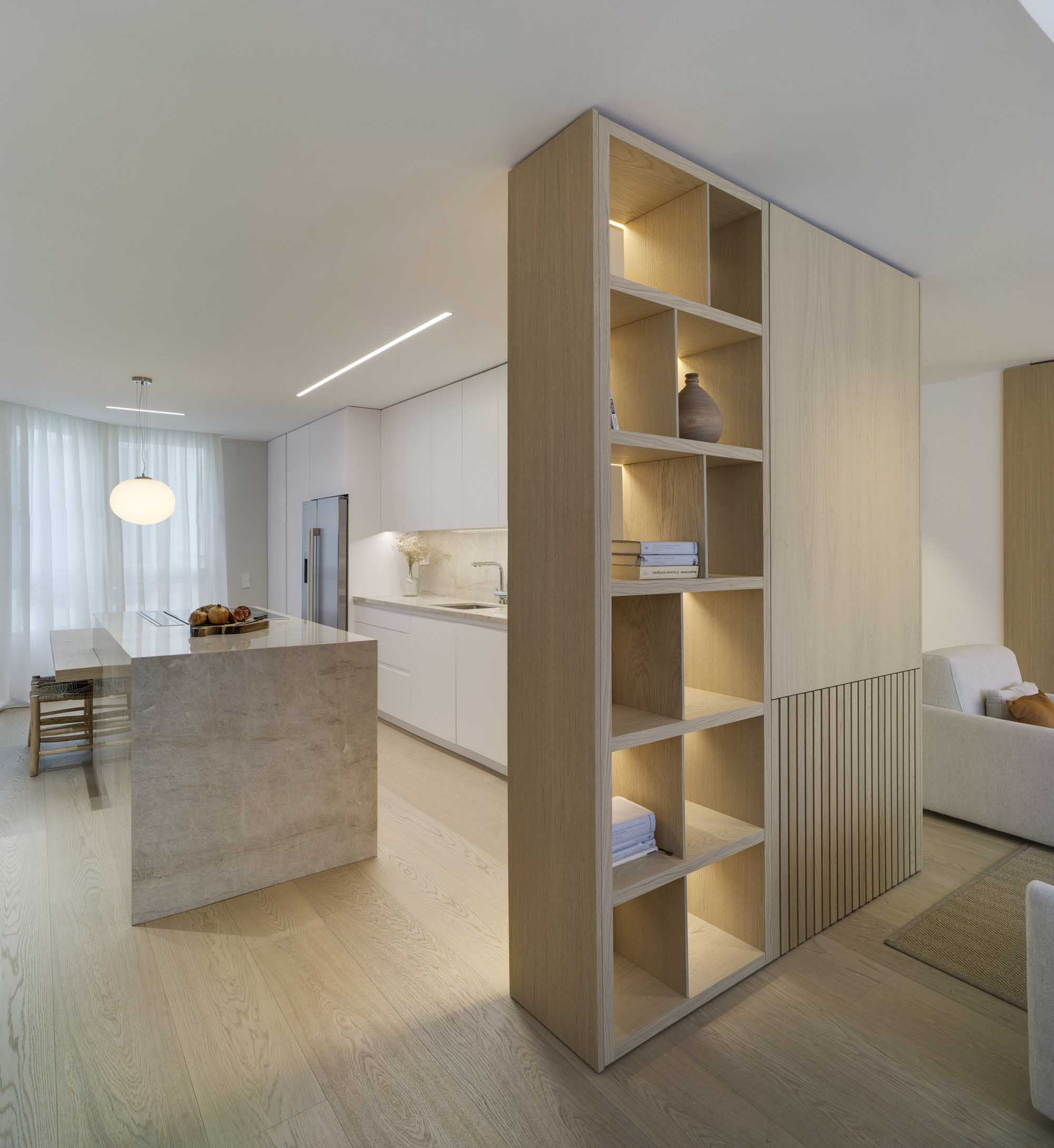 Entre el salón y la cocina se ubica el volumen  de armario-librería que articula la zona de día. El diseño de la librería con los separadores de libros colocados a modo de celosía permite disimular y separar ambos espacios además de ocultar una zona de almacenaje, un pilar y un radiador. El toque atractivo reside en su iluminación oculta que permite su regulación mediante  controlador y teléfono móvil.