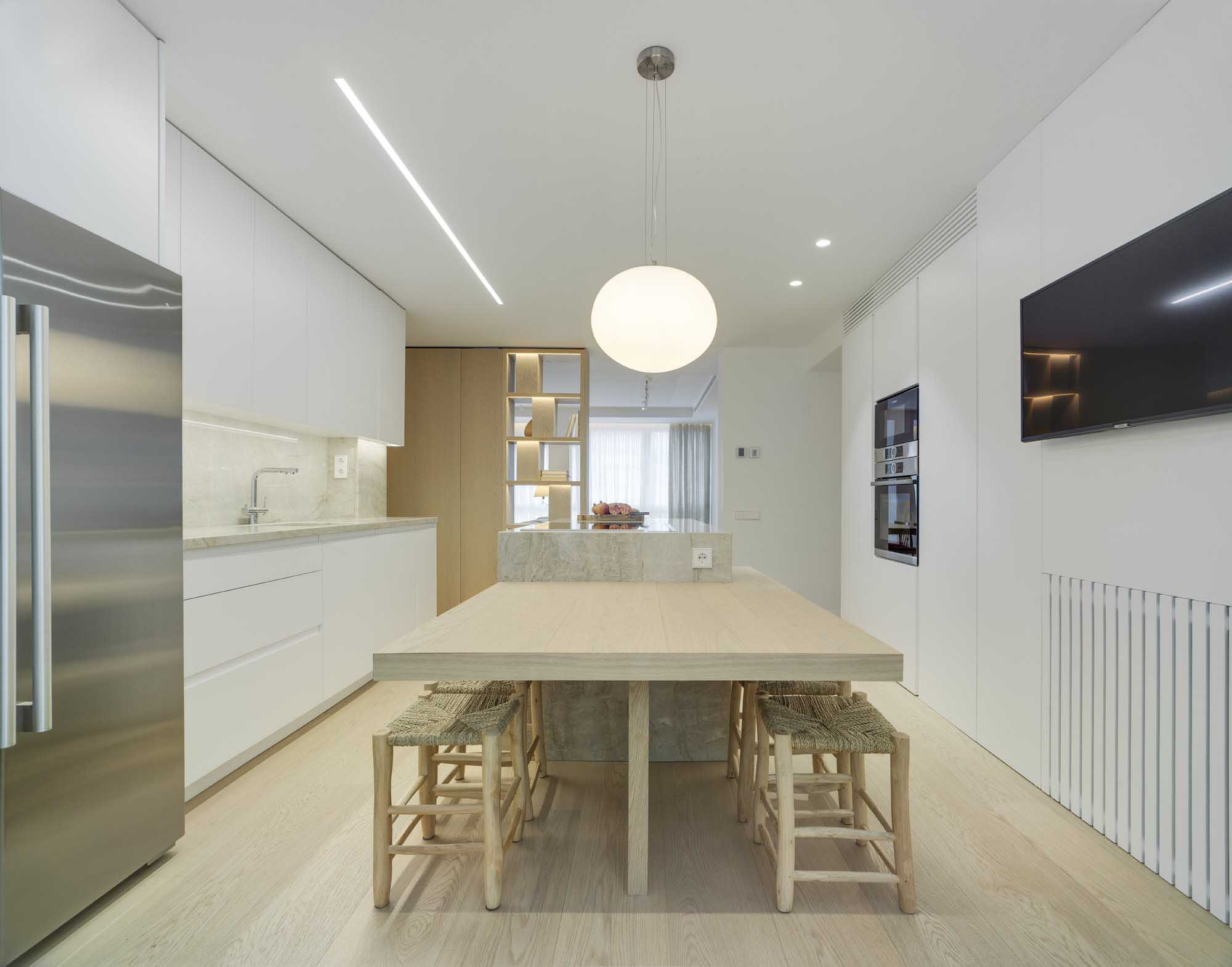 La ubicación de la mesa como extensión de la propia isla resulta muy práctica por la cercanía a la hora de servir los platos al igual que facilita la circulación alrededor de la cocina.Una gran esfera de cristal (Nimes de LEDSC4) cae sutilmente sobre la mesa proporcionando una iluminación suave y cálida.