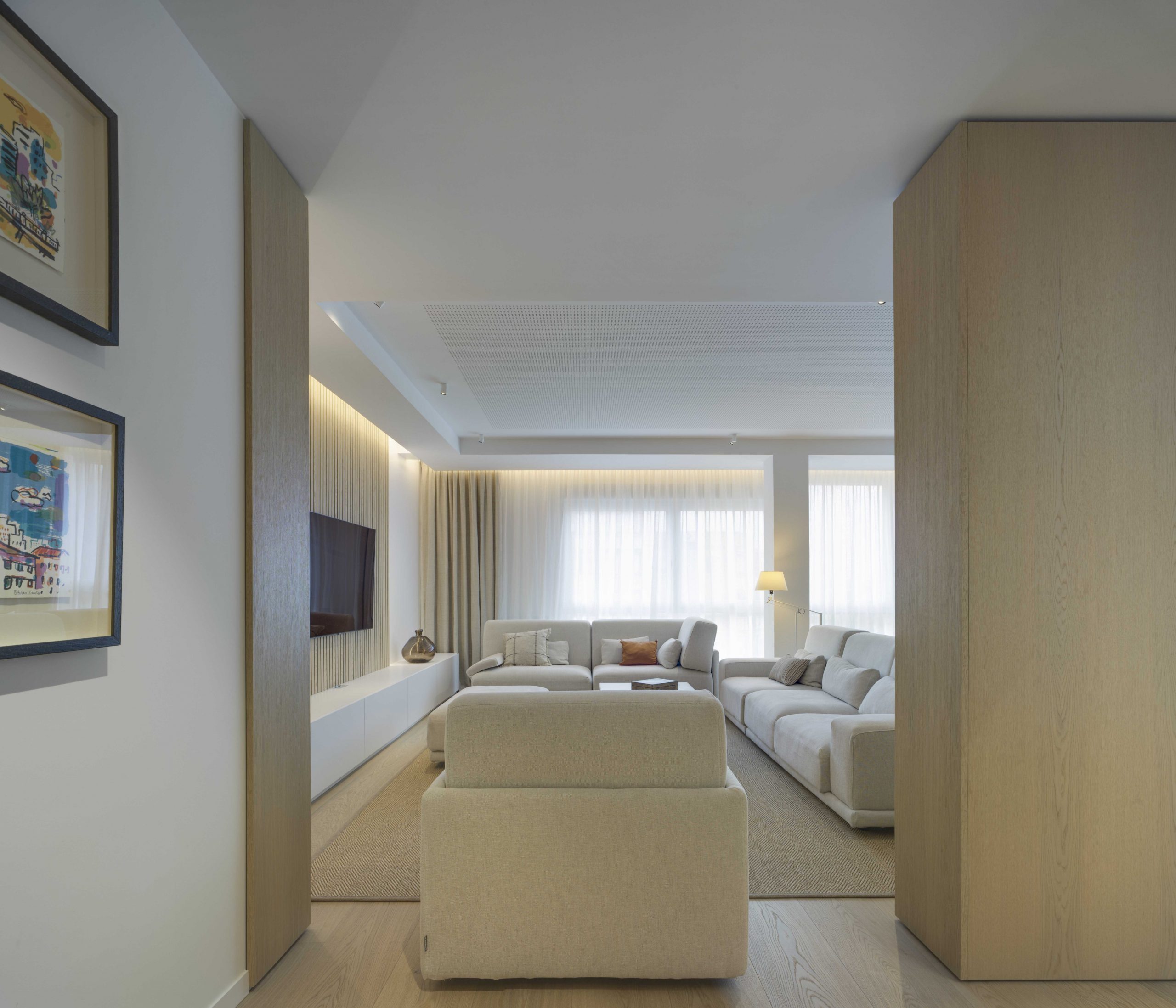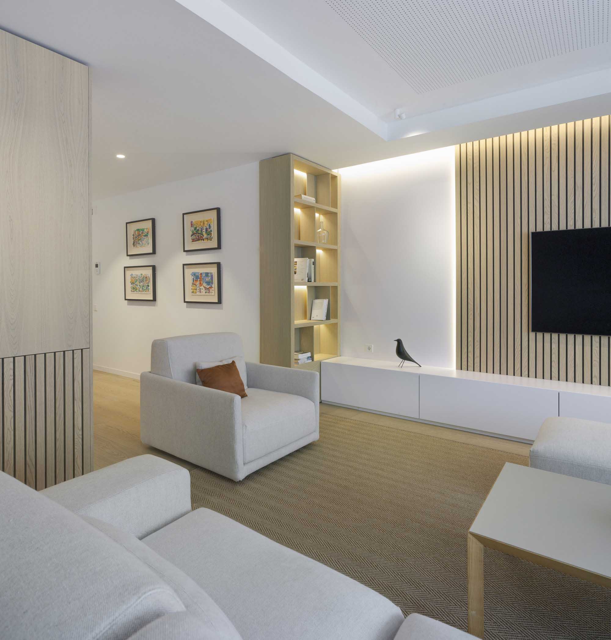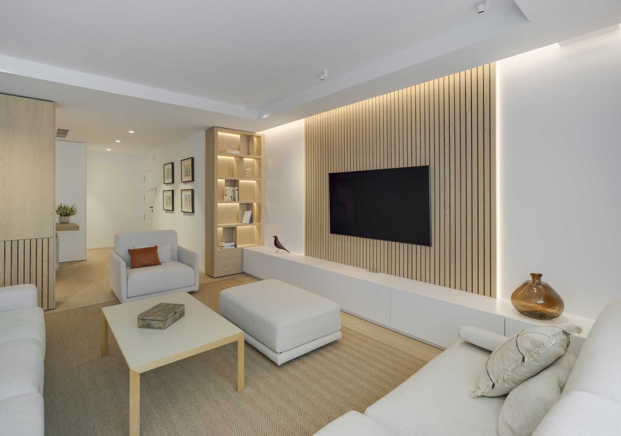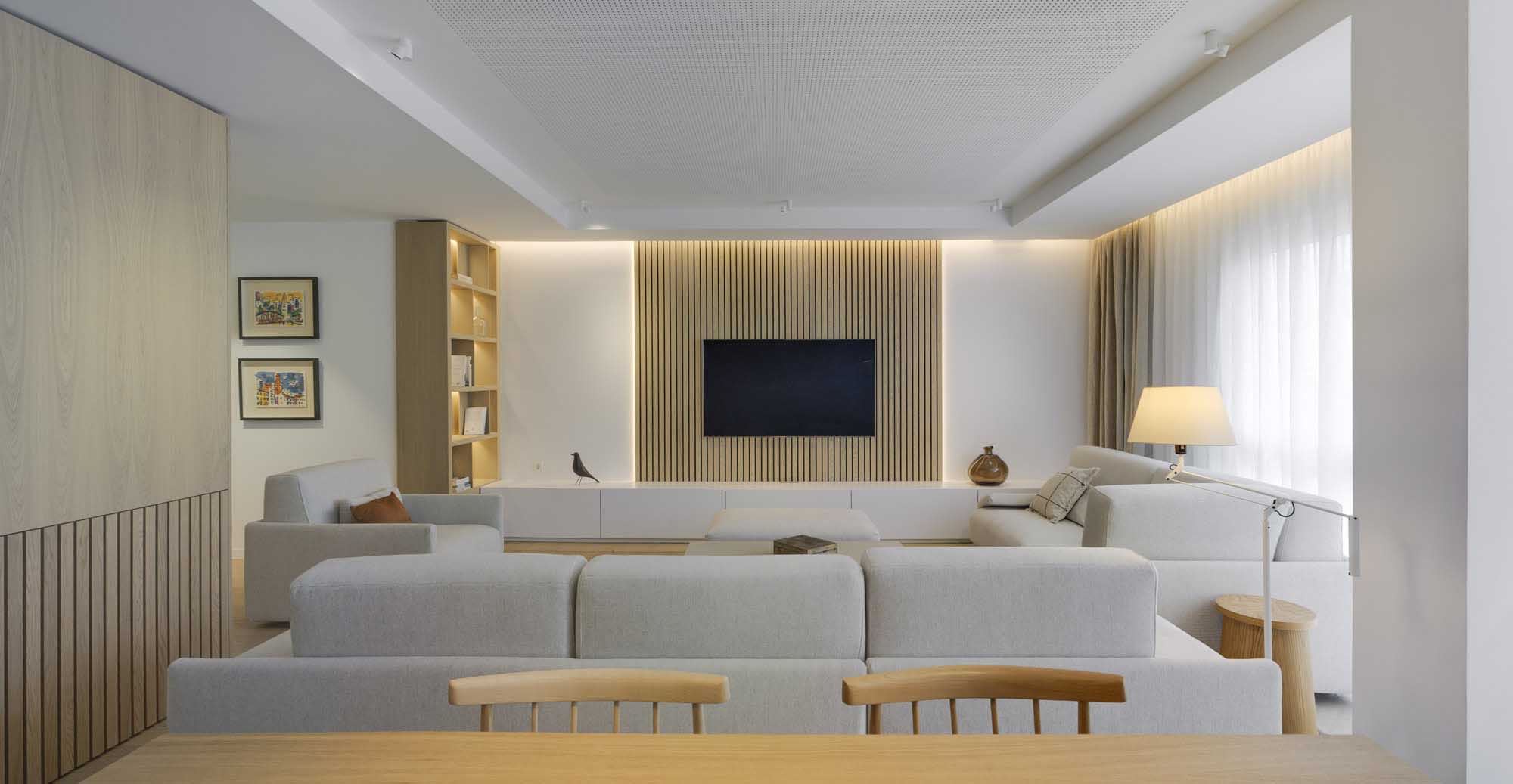 Este tipo de equilibrio visual organiza tanto el mobiliario, la iluminación lateral a ambos lados de la televisión, los focos de superficie (iO de ArkosLight) y el falso techo, dando como resultado un salón más tranquilo, estable y sosegado.