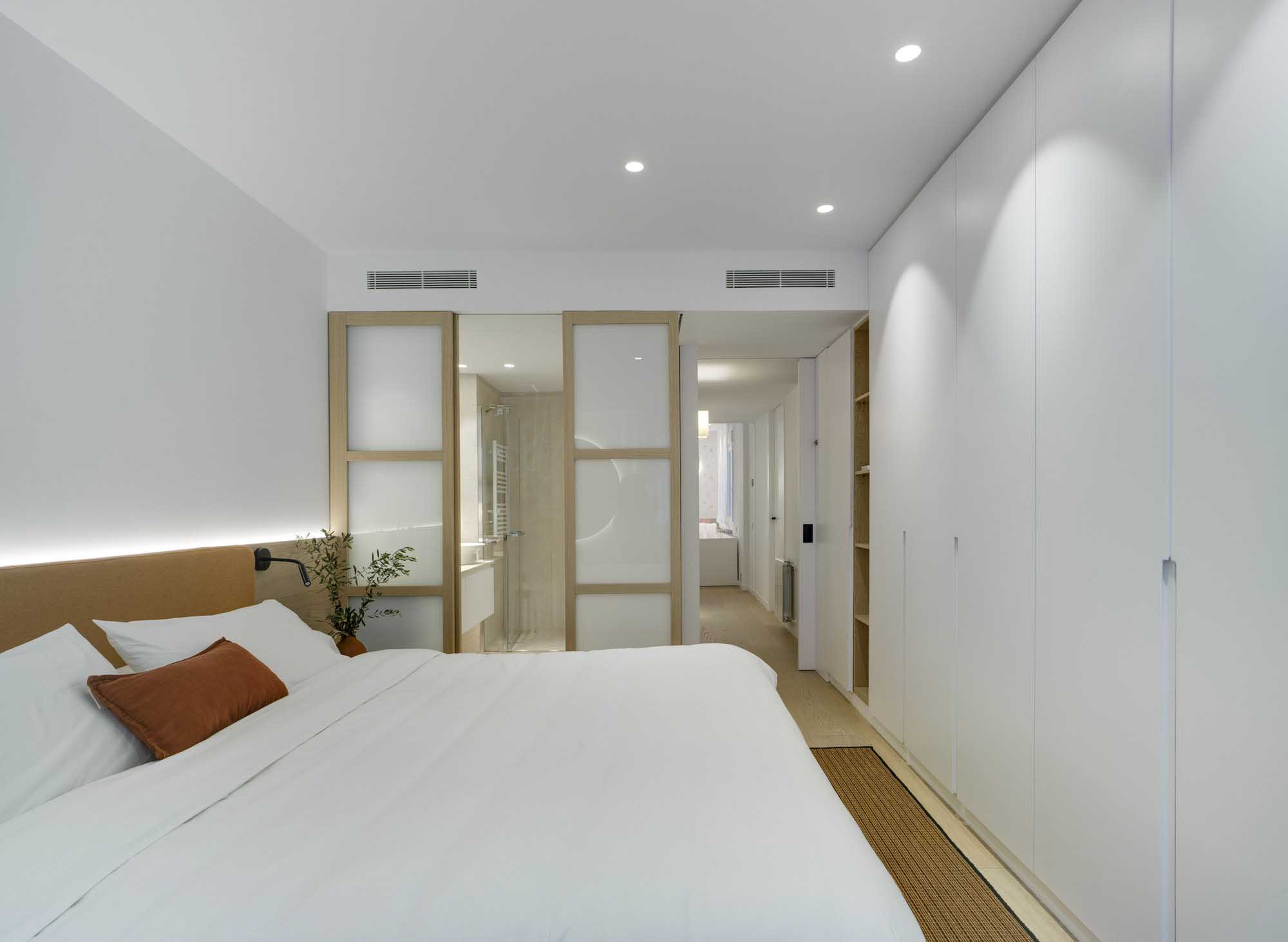 El armario, con tiradores fresados, está lacado en las mismas tonalidades neutras del resto de las paredes e incorpora un módulo de estantes abiertos del mismo acabado en madera de roble blanqueada del resto del proyecto. Este acabado también se repite en el cabecero de cama aportando continuidad al proyecto.