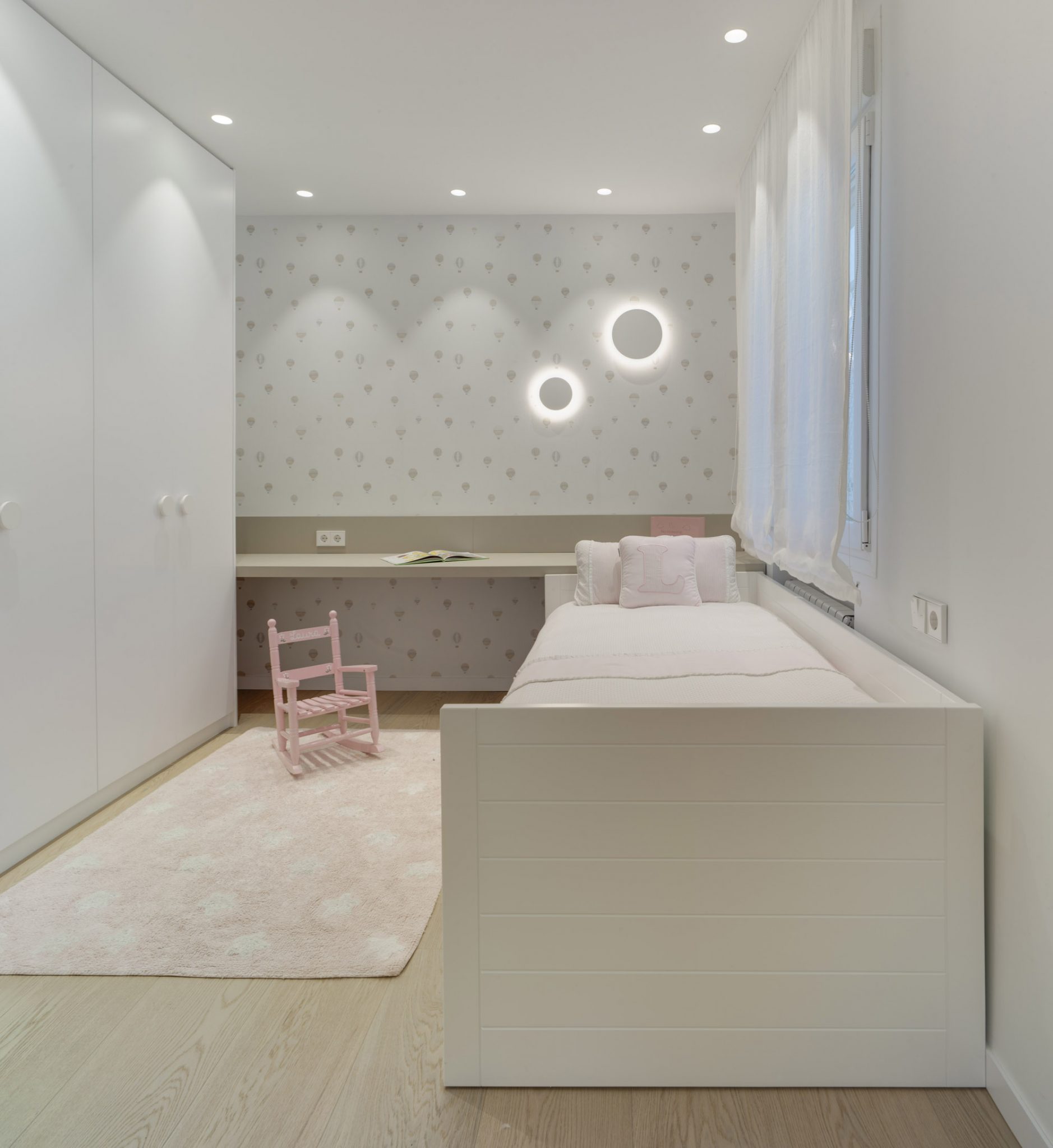 Otro de los detalles en la decoración infantil, fue utilizar  los tiradores de los armarios con forma redondeada al igual que los empleados para los apliques de pared.