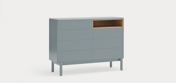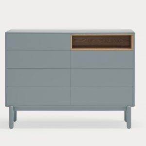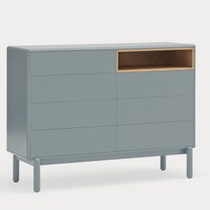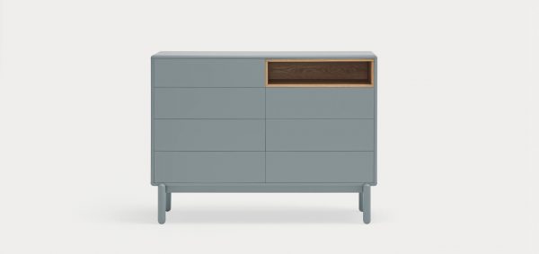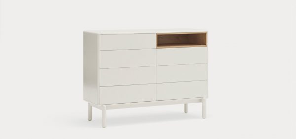 Cómoda Corvo I. La cómoda Corvo tiene una silueta redondeada, de líneas suaves y de aspecto voluminoso. El ensamblaje de sus piezas quedan integradas mostrando un aspecto muy limpio y cuidado. Se encuentra disponible en color crema y gris perla, con un nicho forrado en chapa de roble . Además dispone de siete amplios cajones  y  un nicho para un almacenaje extra. Un diseño perfecto para un almacenaje extra tan necesario en nuestras viviendas. Tanto si decides ponerla en un dormitorio como apoyo del armario, como para ropa de cama y toallas o para el salón donde guardar mantelería, cubertería…etc. Su diseño encaja en cualquier estancia de una vivienda.