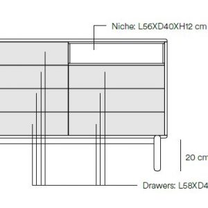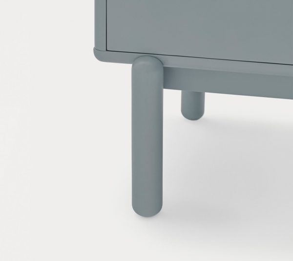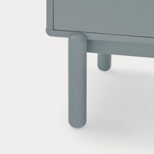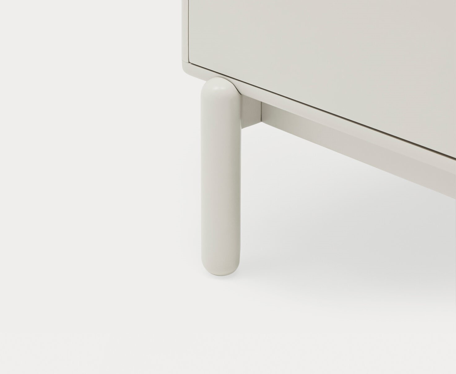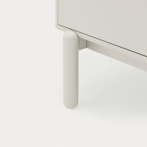 Cómoda Corvo I. La cómoda Corvo tiene una silueta redondeada, de líneas suaves y de aspecto voluminoso. El ensamblaje de sus piezas quedan integradas mostrando un aspecto muy limpio y cuidado. Se encuentra disponible en color crema y gris perla, con un nicho forrado en chapa de roble . Además dispone de siete amplios cajones  y  un nicho para un almacenaje extra.