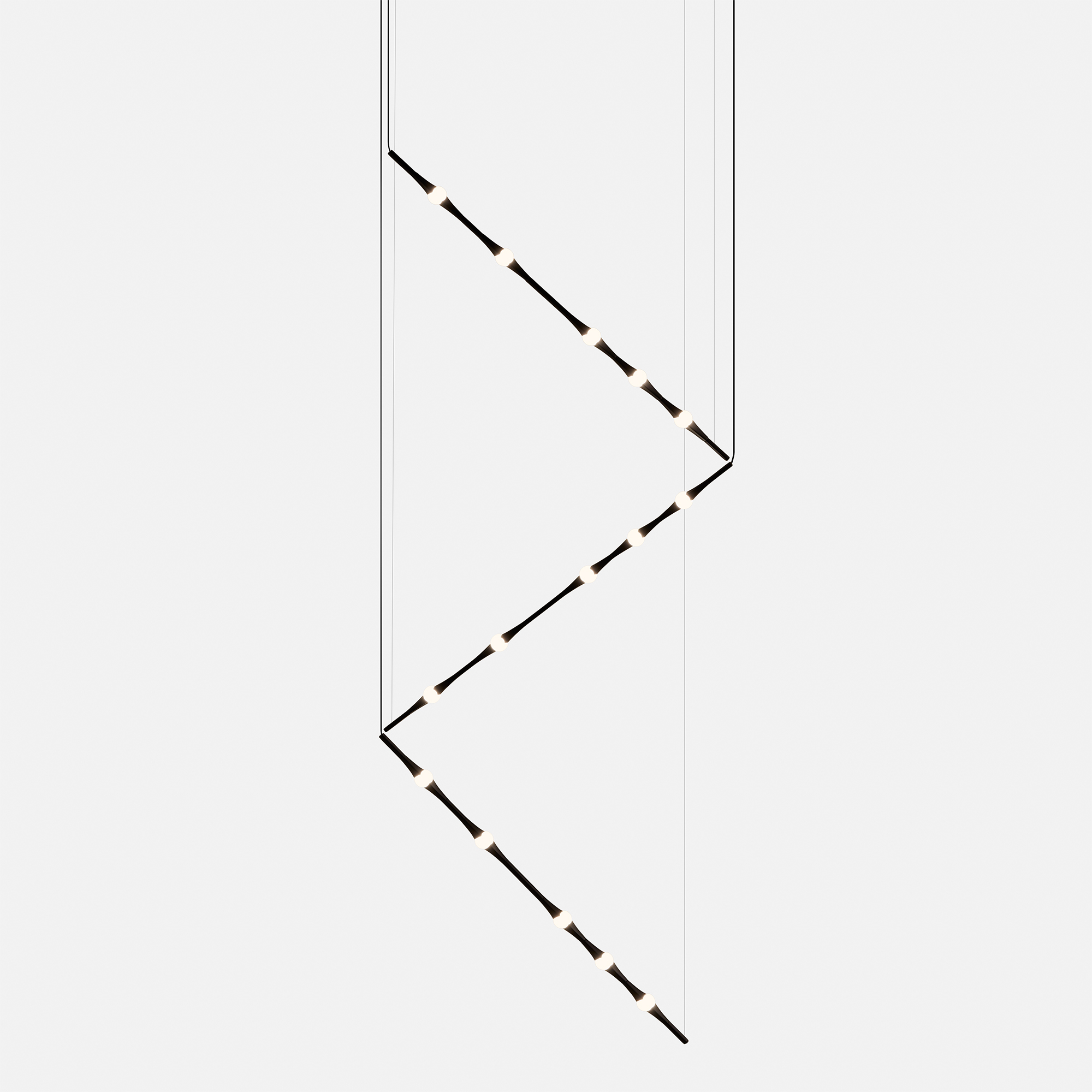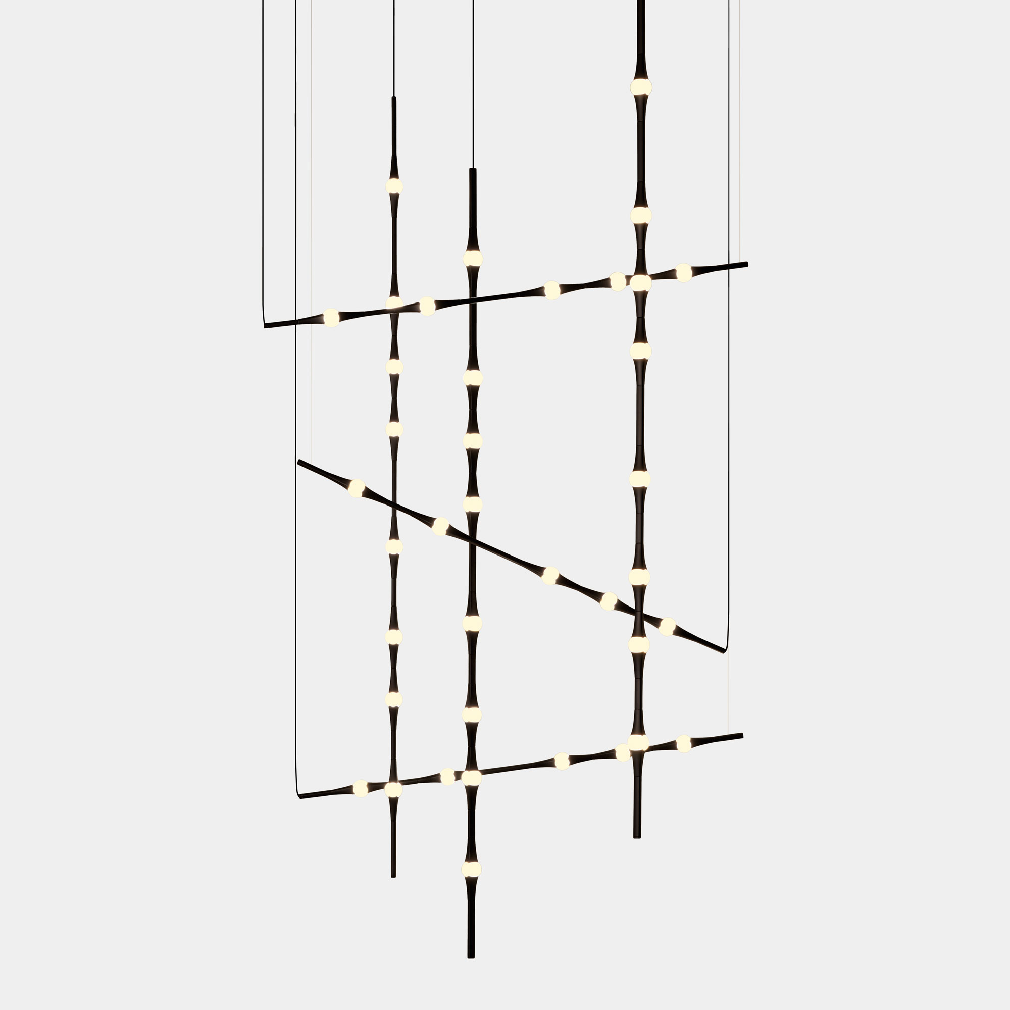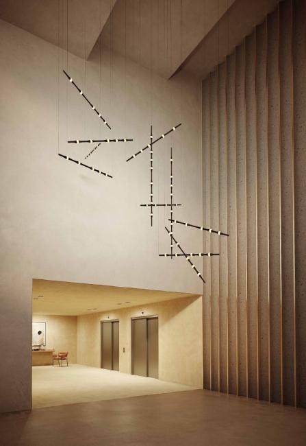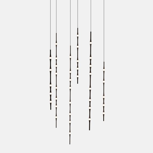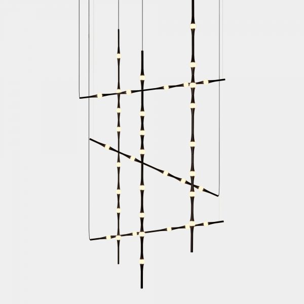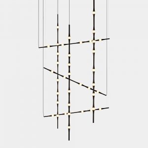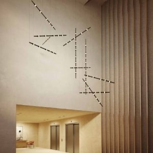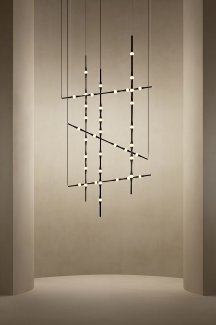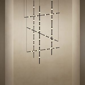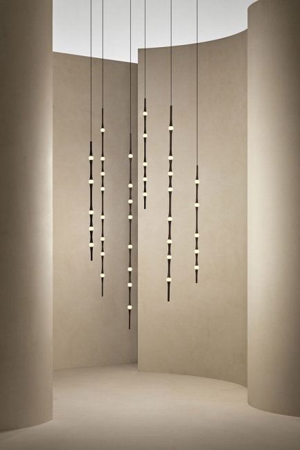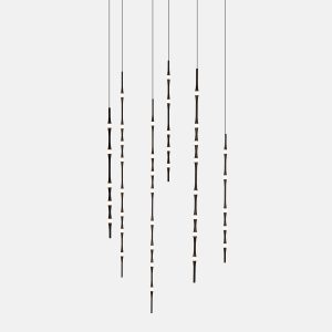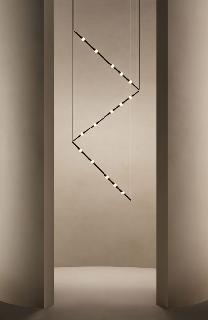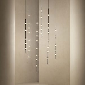 Dew se presenta con sus versiones en vertical y en horizontal, permitiendo todas las combinaciones e inclinaciones posibles. Por su sutileza y versatilidad, encaja en cualquier tipo de espacio como lámpara compuesta para halls, huecos de escalera, recibidores, etc. Compatible con instalaciones que precisen grandes caídas.