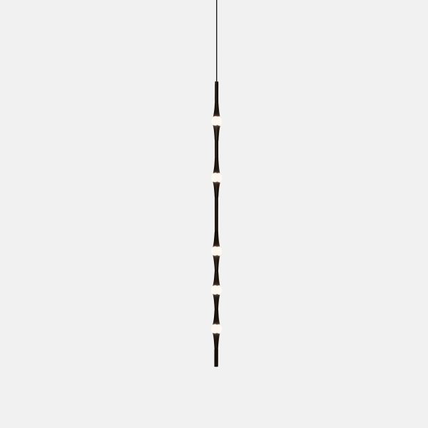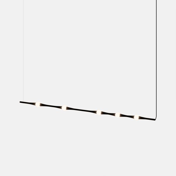 Lámpara suspendida Dew. La lámpara Dew está entre lo ligero y lo efímero. Se trata de una composición orgánica y longitudinal ue se conforma a partir de una línea de puntos de luz ovalados unidos entre sí por piezas de aluminio a distintas distancias . Es una lámpara con fuerte carácter técnico, pero que no pierde su enfoque poético.