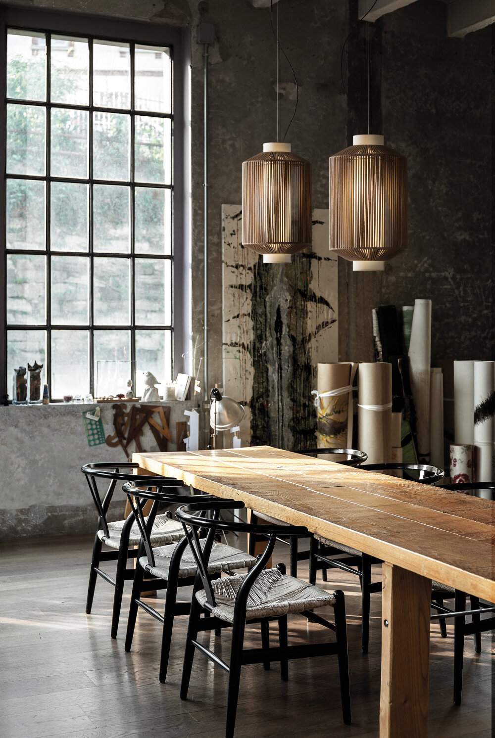 LÁMPARA COLGANTE ESTIU. La lámpara suspendida Estiu combina la técnica de cuerda con el algodón de una pantalla cilíndrica de sujeción interna que parece flotar en el aire. Su luz y forma nos traslada a un anochecer de verano donde los farolillos son los protagonistas.