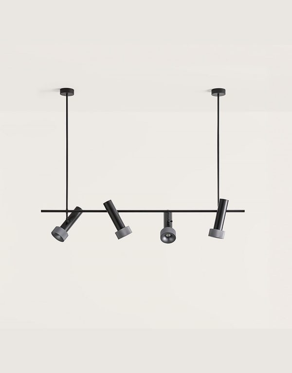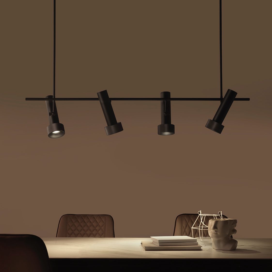 Lámpara colgante Focus 4. La lámpara colgante Focus, de la amplia colección Focus de Aromas del Campo, es una pieza perfecta. Ideal para iluminar grandes mesas, islas de cocina o mesas de reunión, es una luminaria versátil y funcional. Sus 4 focos son dirigibles y sus cabezales pueden tener acabados muy variados en función del espacio.