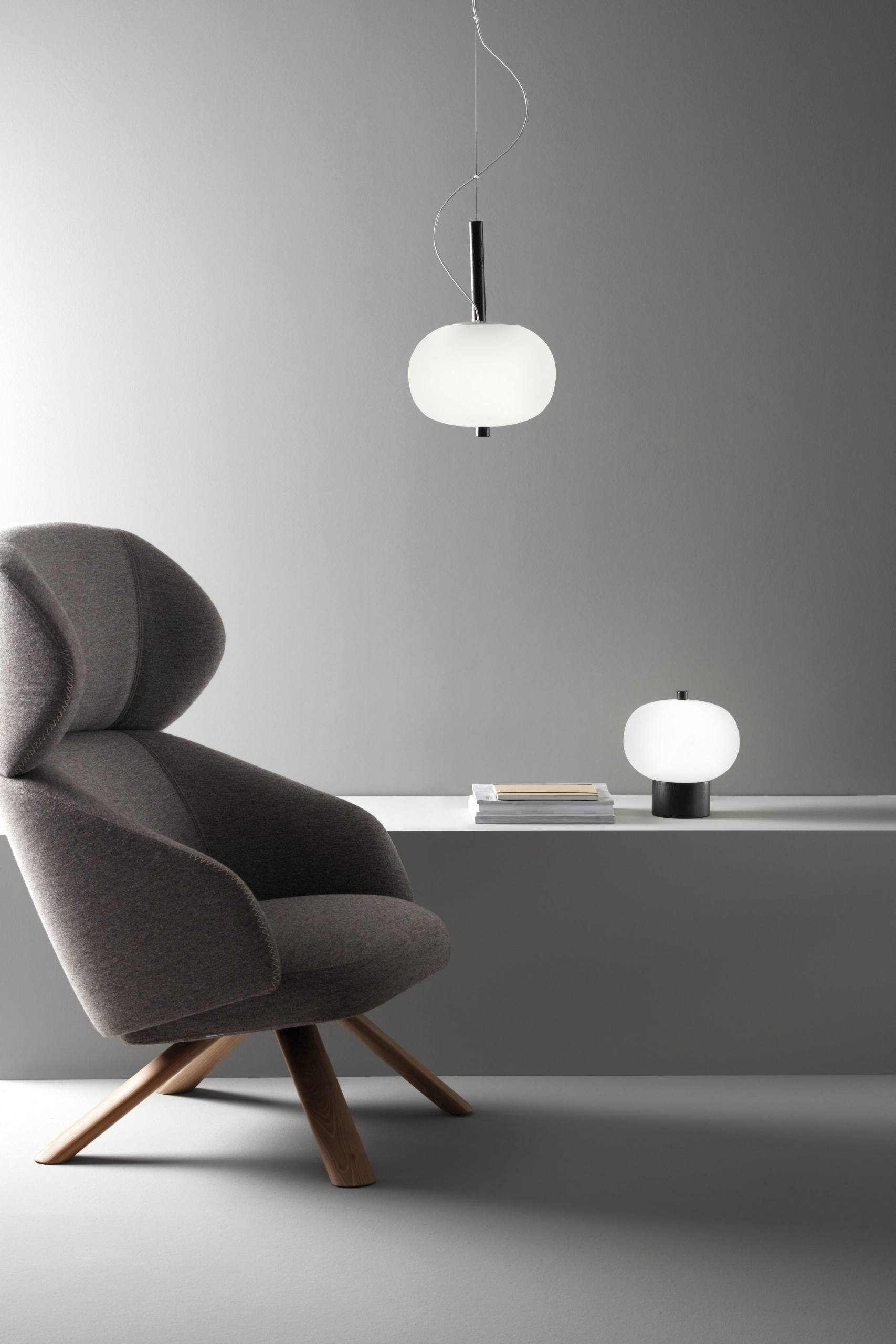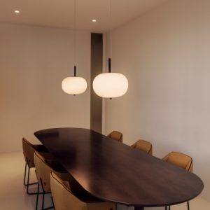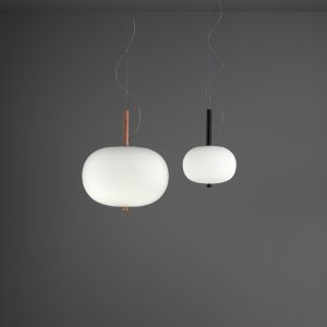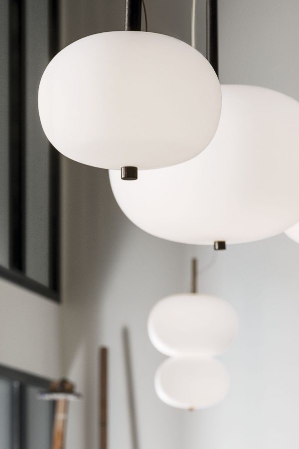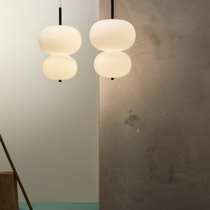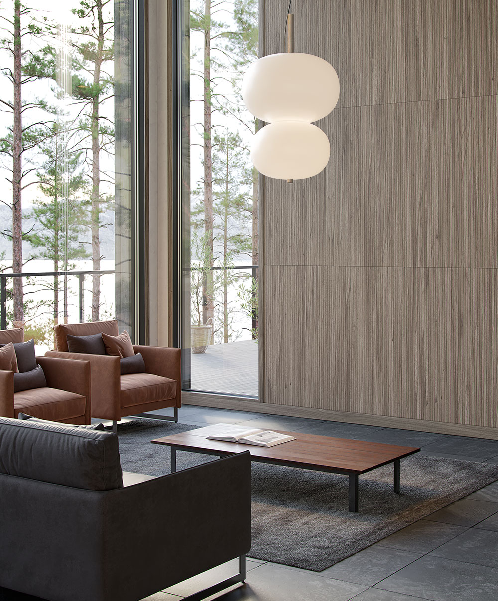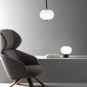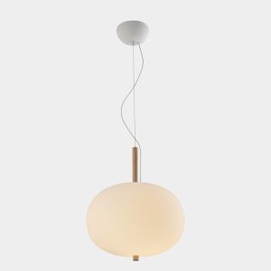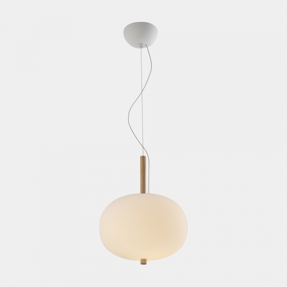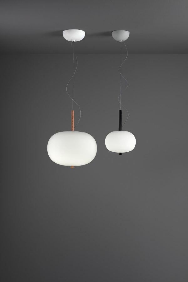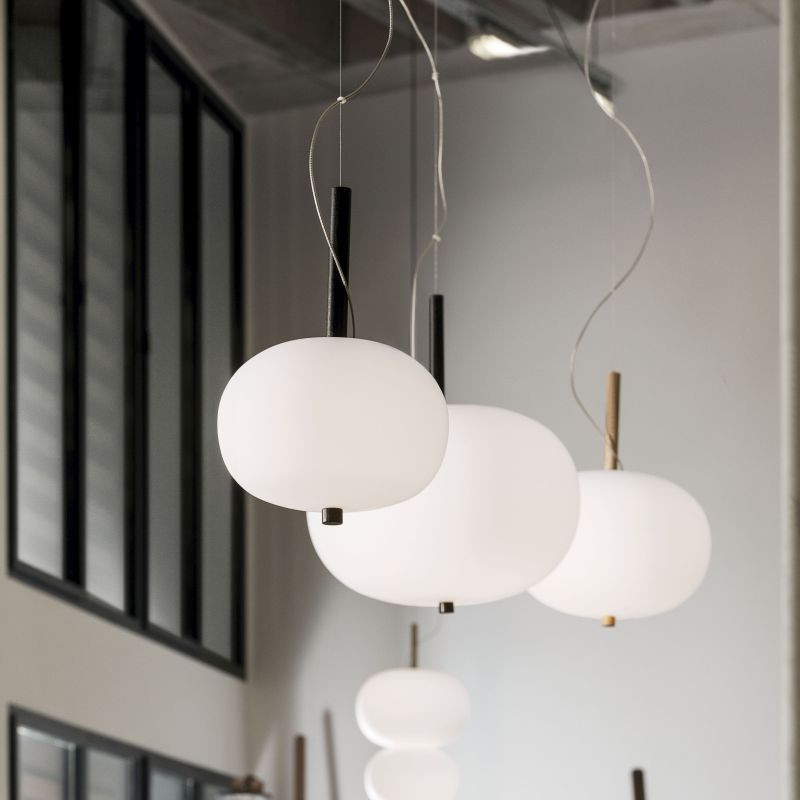 Lámpara colgante Ilargi.  Ilargi, diseñada por el estudio vasco Iratzoki Lizaso, se materializa en una intervención sutil y mínima en la que una vara de madera se introduce en unas esferas de vidrio soplado hechas a mano de manera tradicional. Su diseño afectivo y atemporal consigue una luz suave y agradable que se adapta tanto a espacios profesionales como domésticos. Creando ambientes confortables y naturales. Queda suspendida en el aire como un elemento escultórico