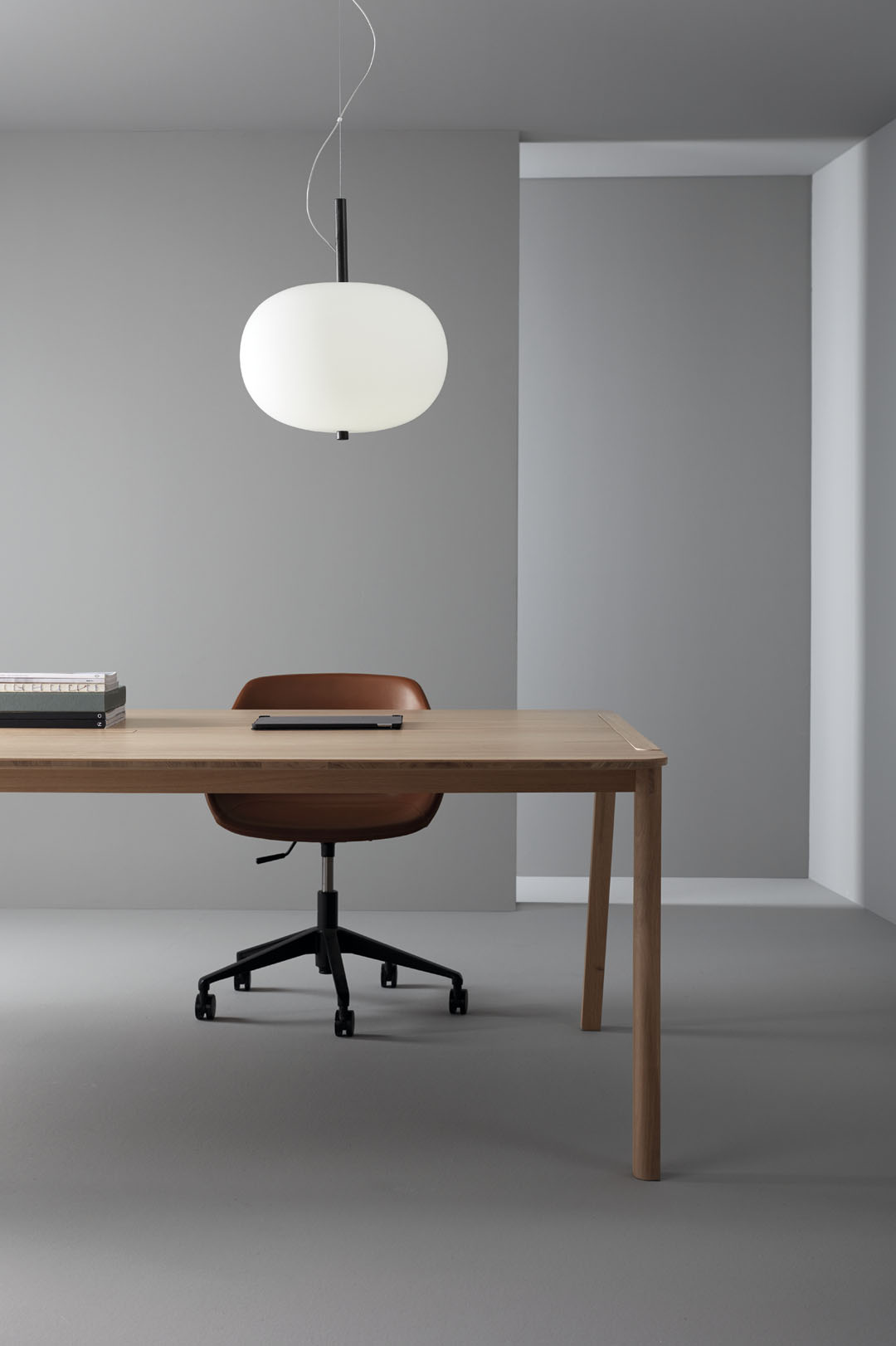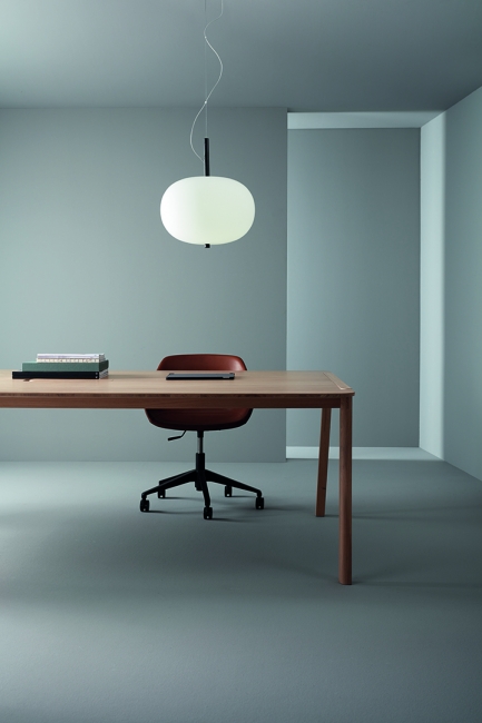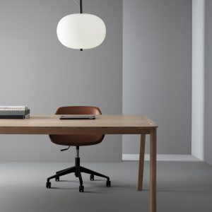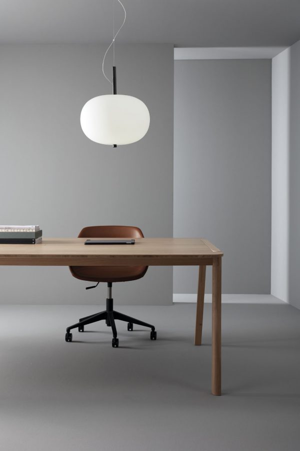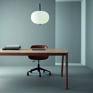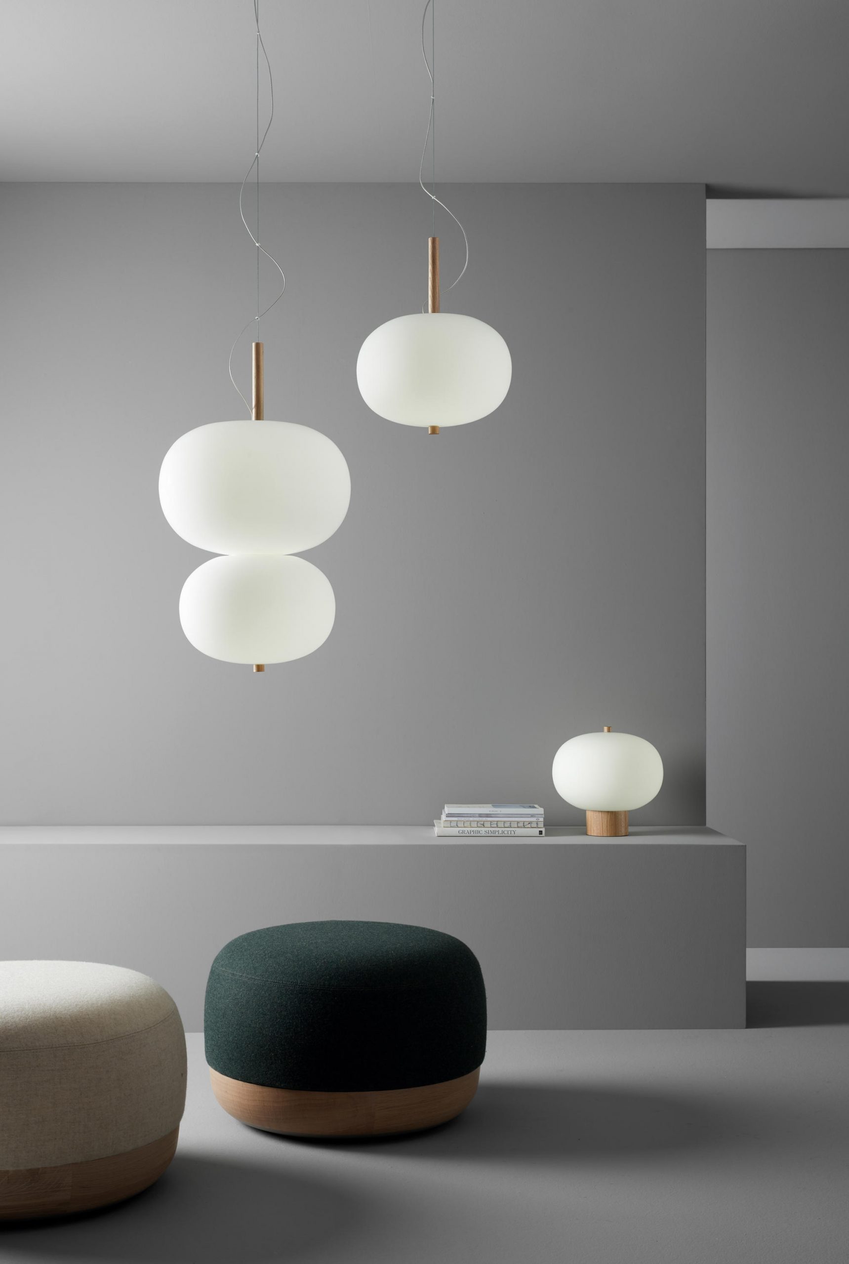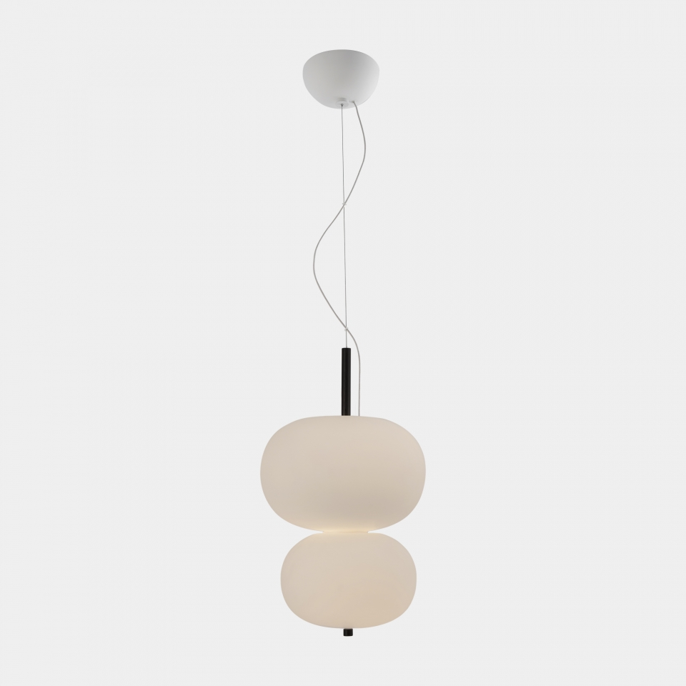 Lámpara colgante Ilargi.  Ilargi, diseñada por el estudio vasco Iratzoki Lizaso, se materializa en una intervención sutil y mínima en la que una vara de madera se introduce en unas esferas de vidrio soplado hechas a mano de manera tradicional. Su diseño afectivo y atemporal consigue una luz suave y agradable que se adapta tanto a espacios profesionales como domésticos. Creando ambientes confortables y naturales. Queda suspendida en el aire como un elemento escultórico