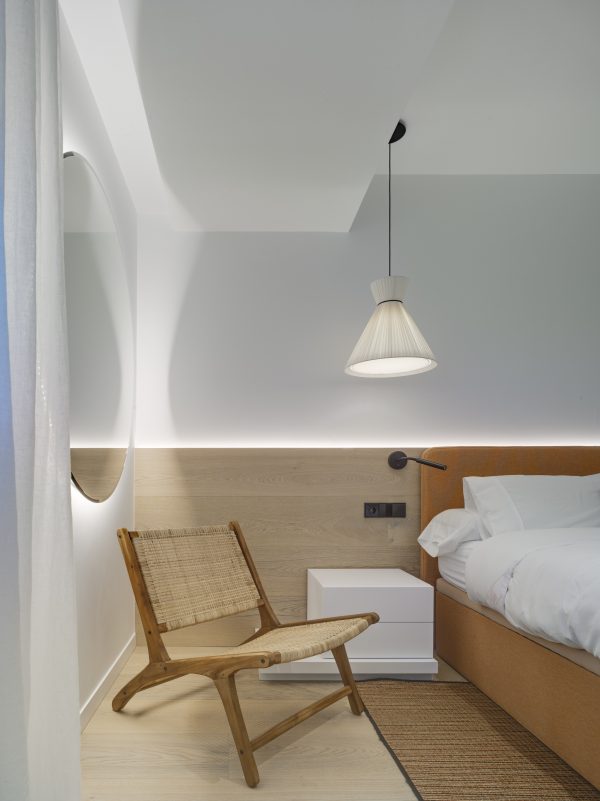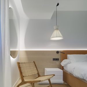 Casa bel: en este caso, la lámpara suspendida Mandarina fue utilizada como iluminación auxiliar en el dormitorio. Su tejido fue el Perla y de tamaño 43 cm Ø dado que se situó a un lado de la cama.