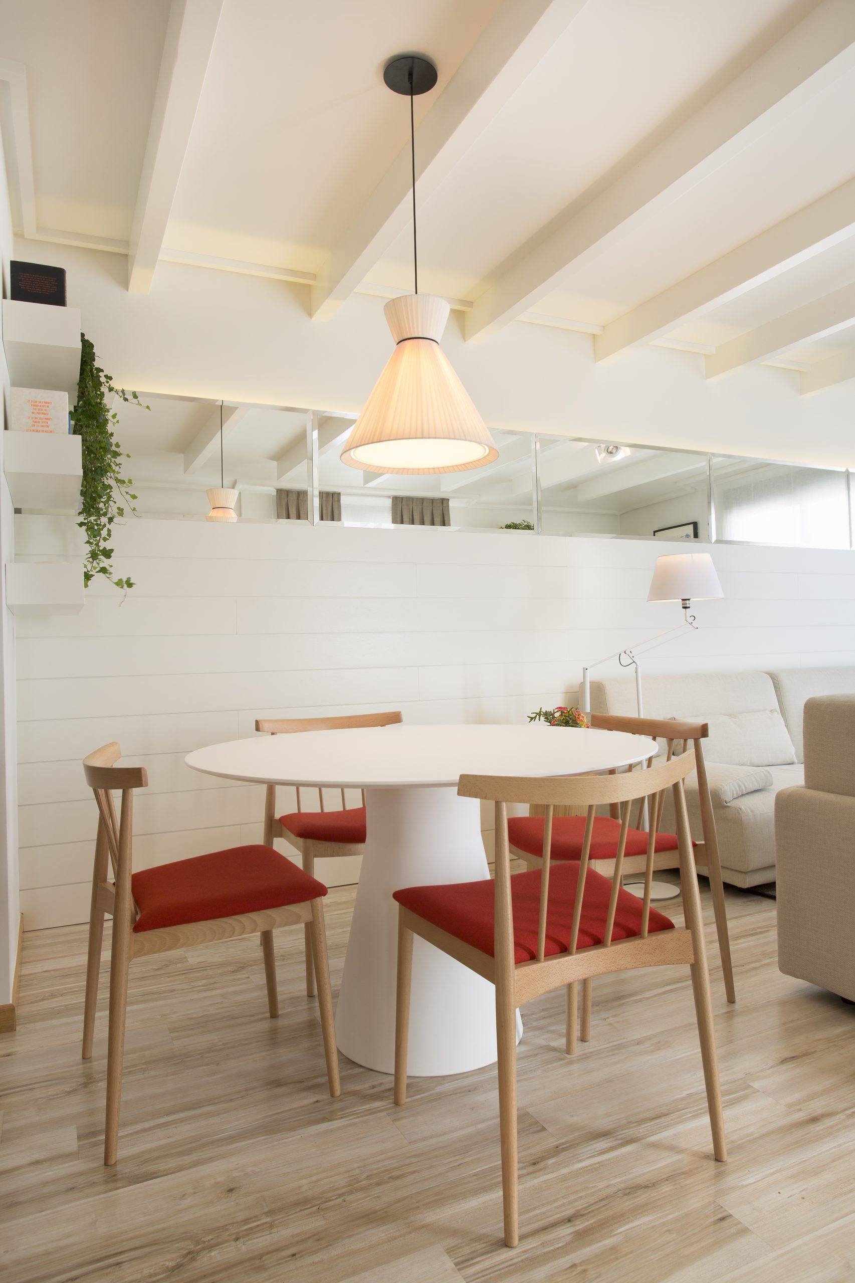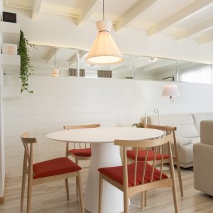 Salón MP: en esta ocasión, la lámpara suspendida Mandarina se utilizo como un elemento más de iluminación general del salón. Situada encima de la mesa de comedor Reverse 50 , dotaba al salón de elegancia y contemporaneidad.