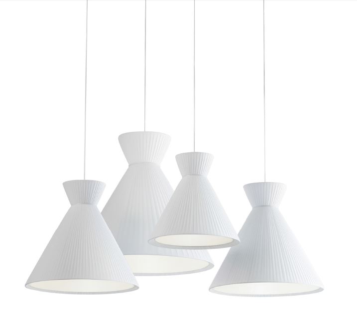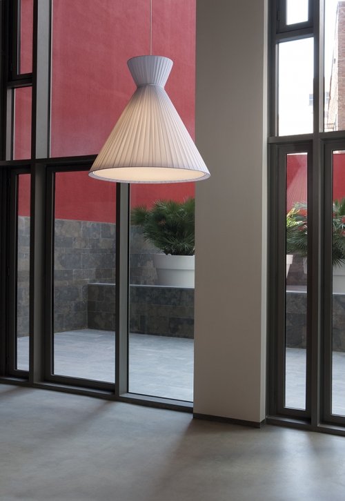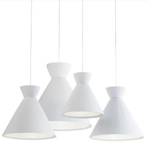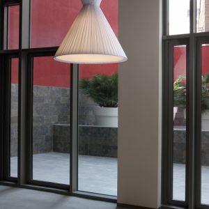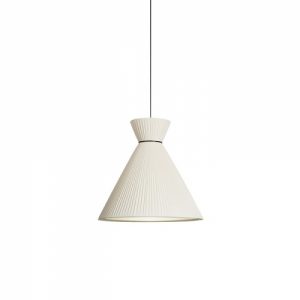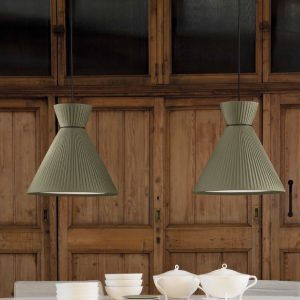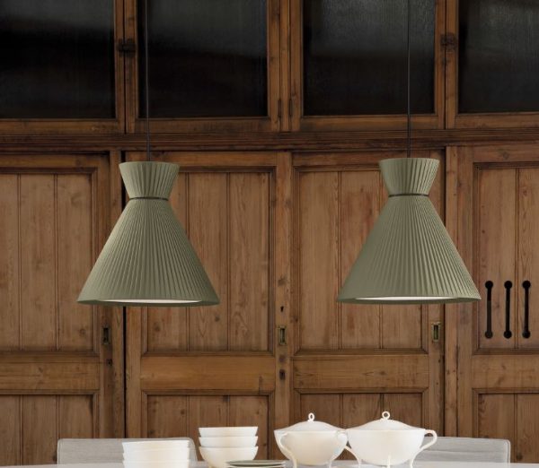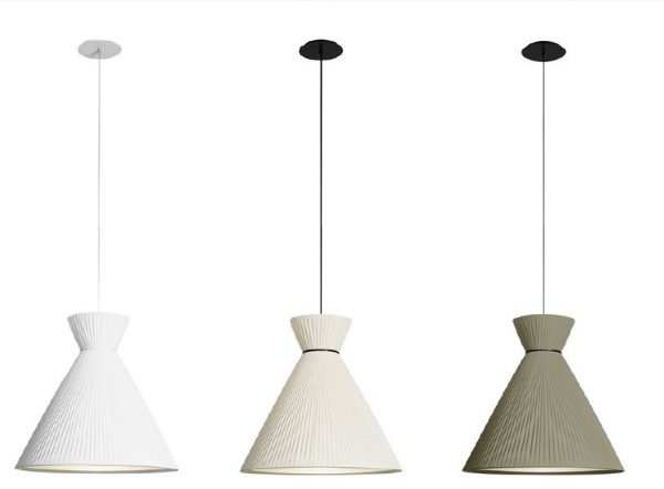 Lámpara colgante Mandarina. La lámpara colgante Mandarina destaca principalmente por el diseño de su pantalla, disponible en Blanca, Perla y Verde oliva. Disponible en varias dimensiones: 43 cm Ø, 55 cm Ø y 75 cm Ø. Lámpara escultórica y protagonista donde se sitúe. Ideal para salones amplios y incluso en dormitorios como luz auxiliar y de apoyo.