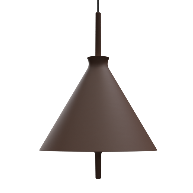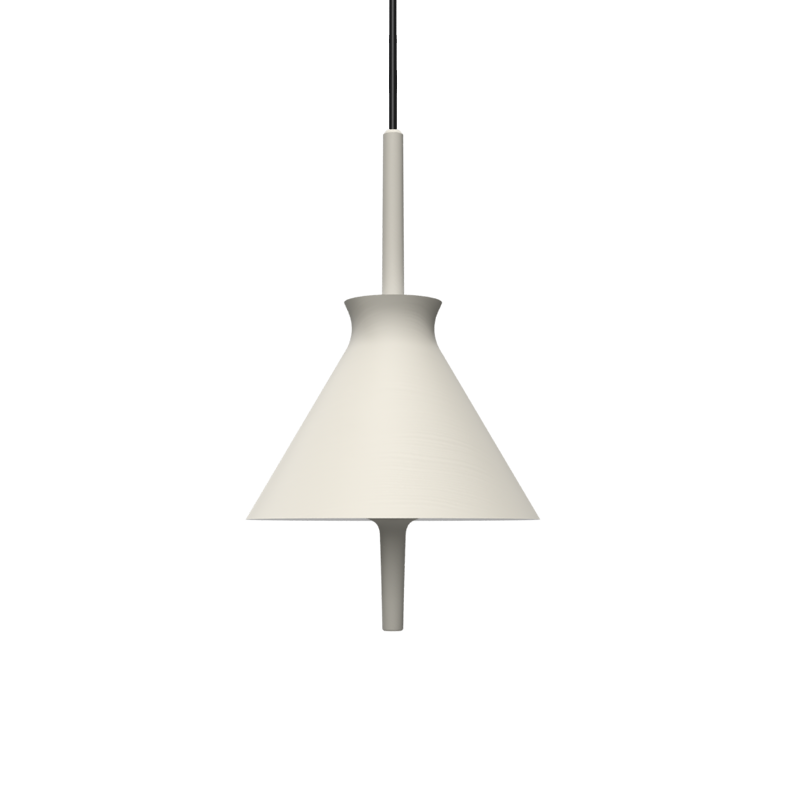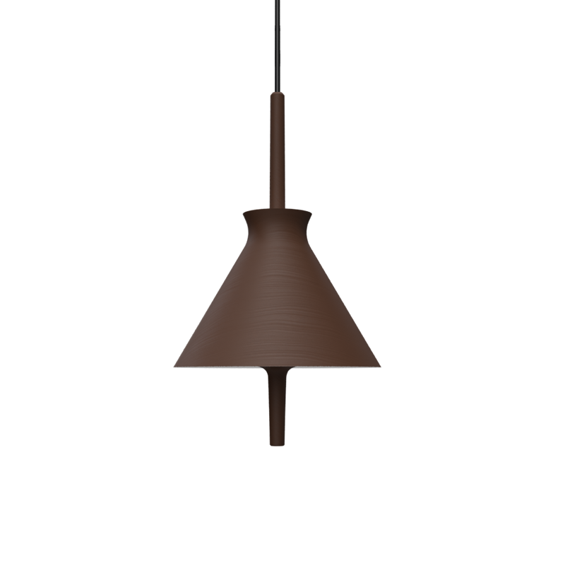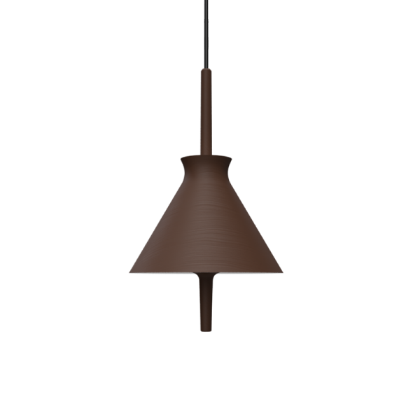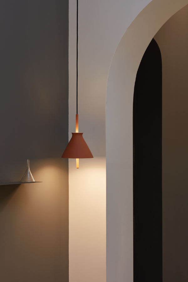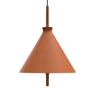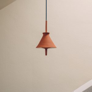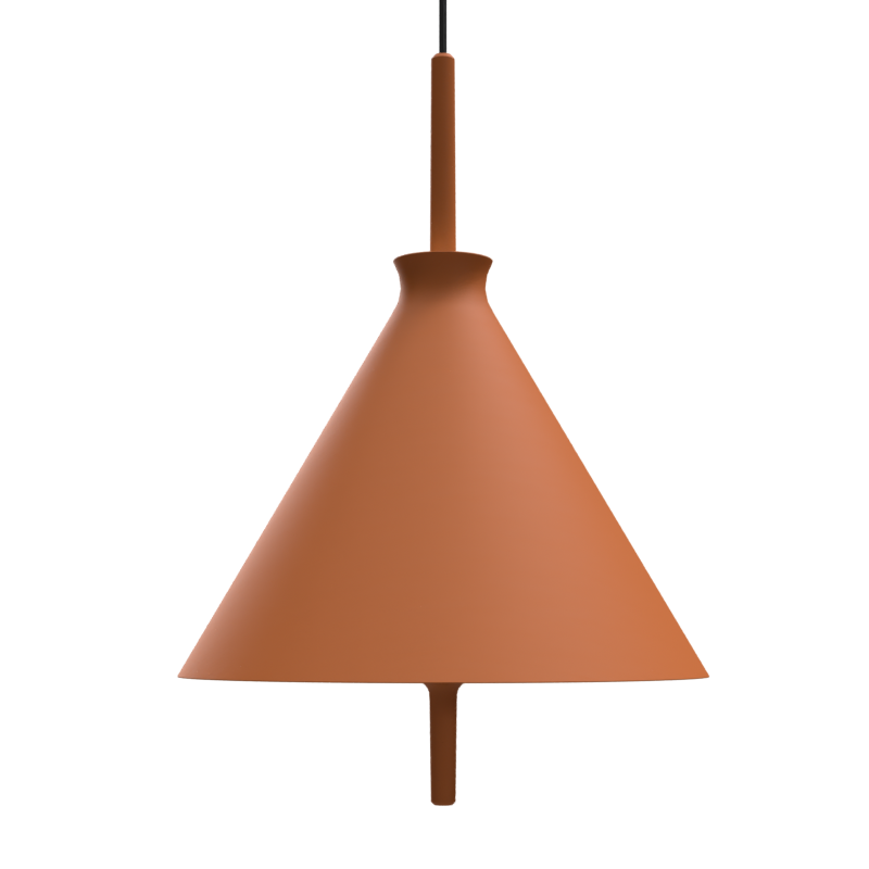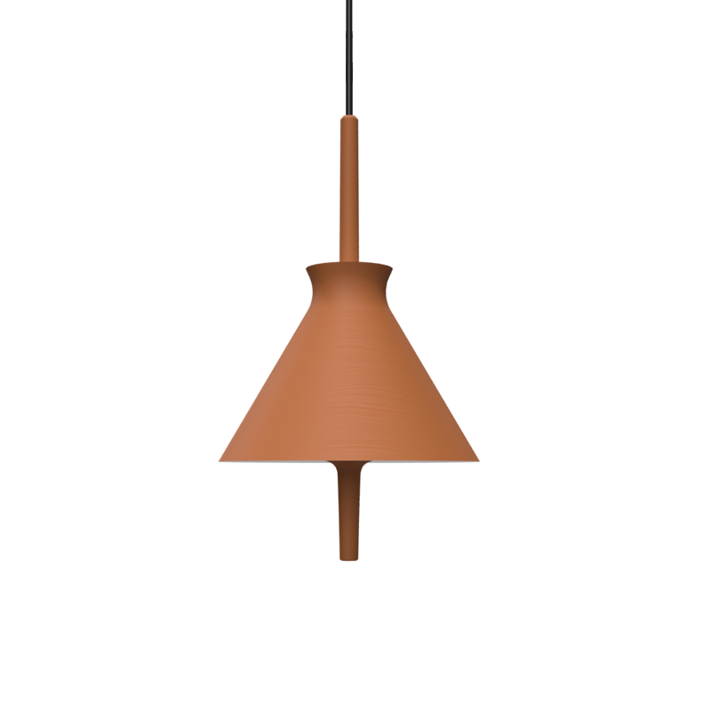 Lámpara colgante Totana. La lámpara suspendida Totana es parte de una colección de luminarias inspirada en los orígenes geográficos de la marca POTT. Totana (Murcia-España) tiene paisaje de contrastes, tonalidades de barro, alfarería y sabiduría, luces y sobres, fuego y agua. Formada por dos volúmenes que se interseccionan. El primero envolvente, gestual, voluminoso, de forma cónica con una terminación superior que hace referencia a la boca de un envase cerámico torneado a mano; y el segundo lineal y estructural, definido como un trazo. Como resultado, una luminaria cálida en equilibrio entre la materialidad y la luz.