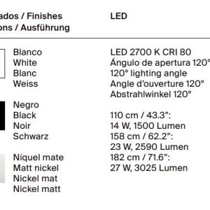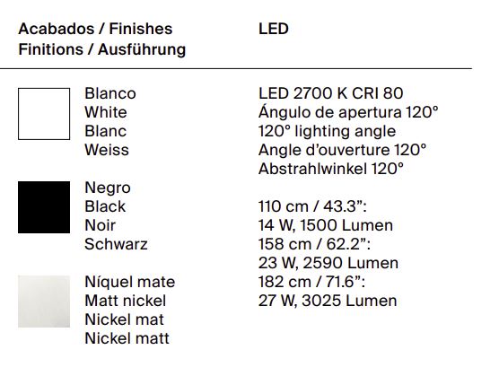 - 158 cm: 23W, 2590 Lumen, ángulo de apertura 120º, 2700 K.