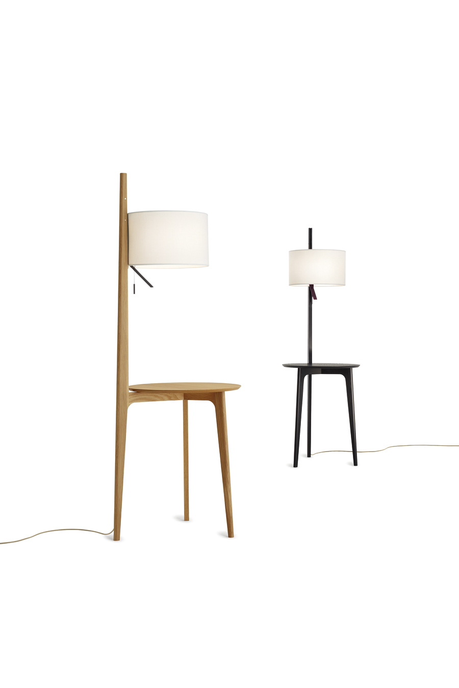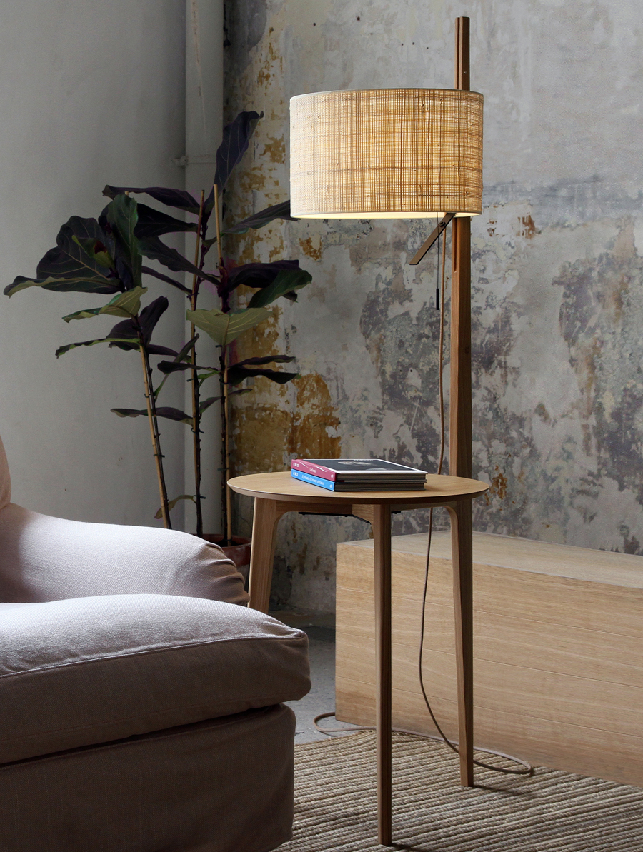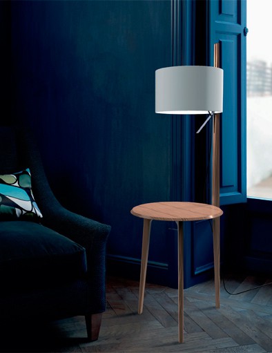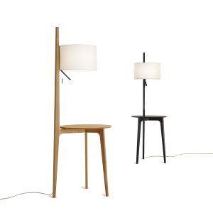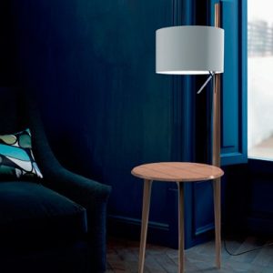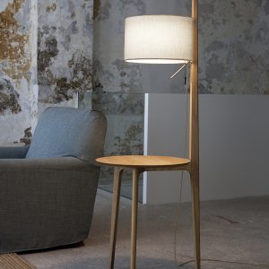 Lámpara de pie Carla. La lampara de pie Carla, es realmente singular. De una mesita de roble sale espigada una gran pantalla iluminando el espacio. Funcional para rincones de salón, incluso al lado de una cama como mesita de noche. Dispone de varios acabados para la madera y diferentes acabados para la pantalla. Un elemento decorativo en toda regla, funcional y atractivo.