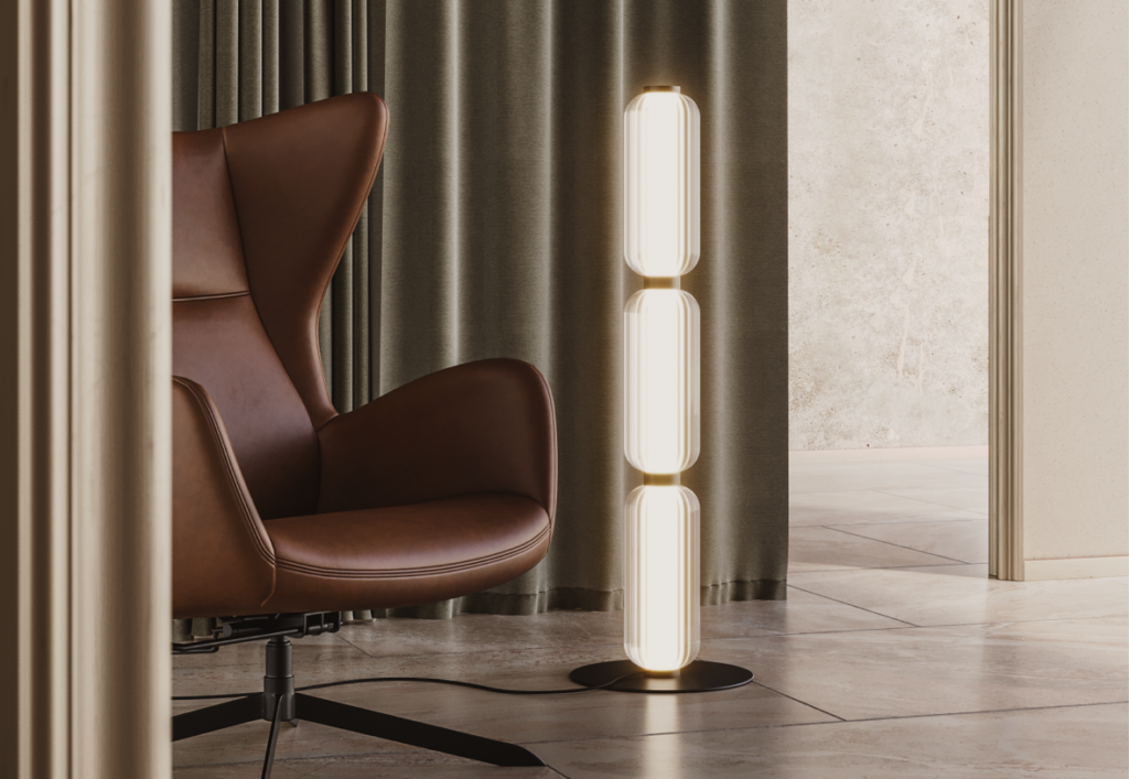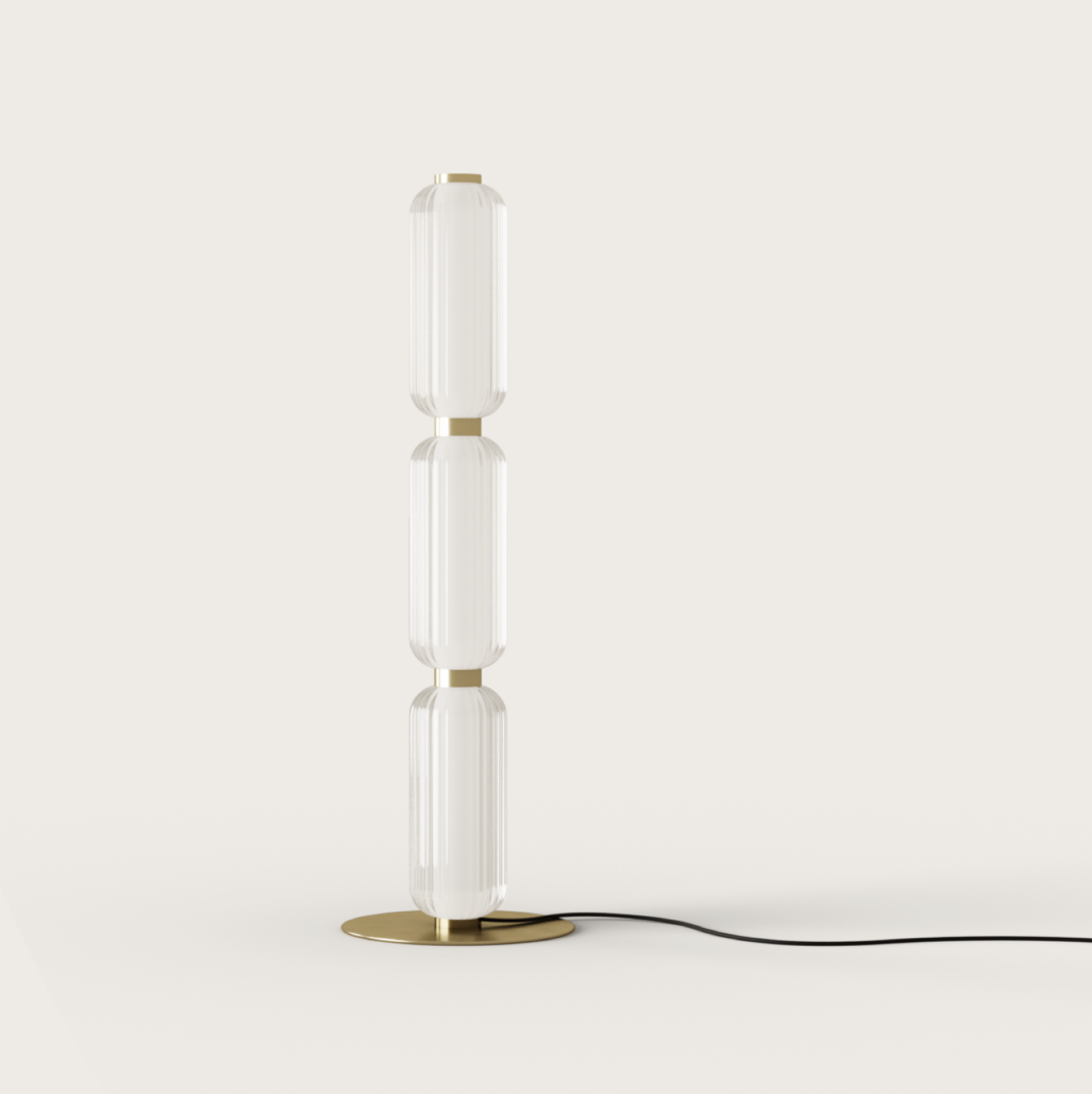 Lámpara de pie Elma. La lámpara de pie Elma es sofisticación. Fabricada en cristal estriado, forma 3 tulipas alineadas muy decorativas. En el interior de las tulipas de cristal rayado hay otra pieza de acrílico ópalo ocultando la fuente de luz y alzando su belleza. La luz que se desprende de esta lámpara es cálida y tenue, proporcionando un ambiente agradable y pausado. Elegante y contemporánea.