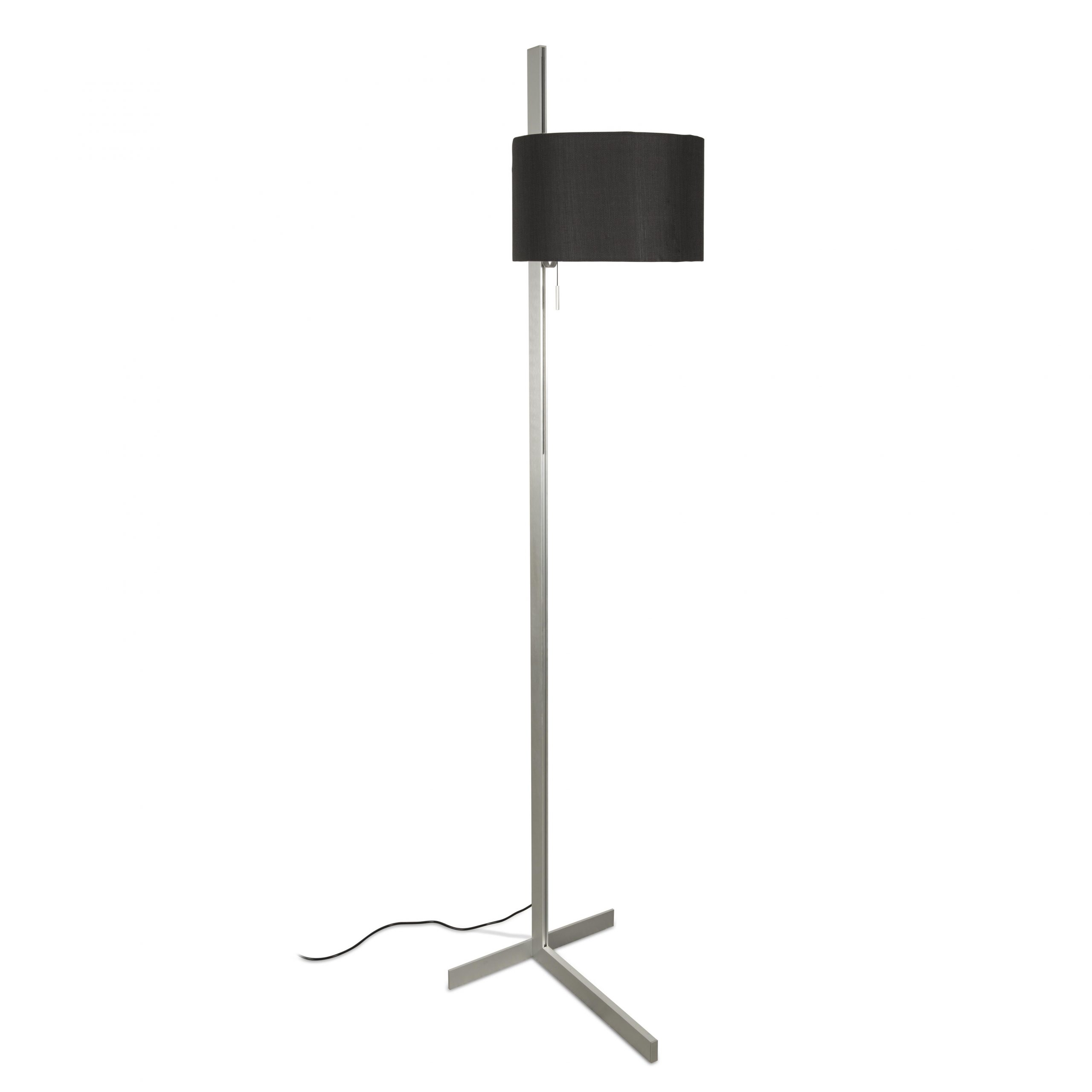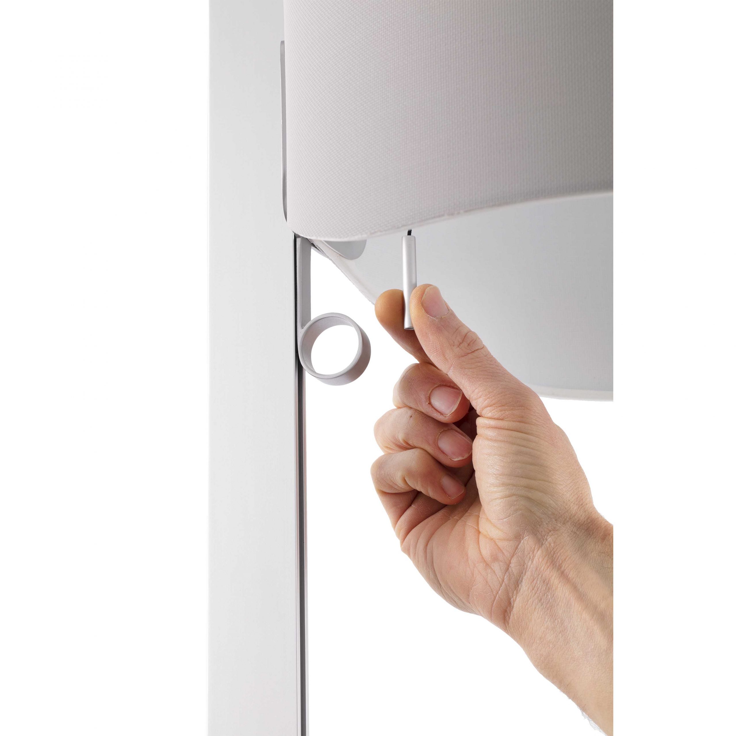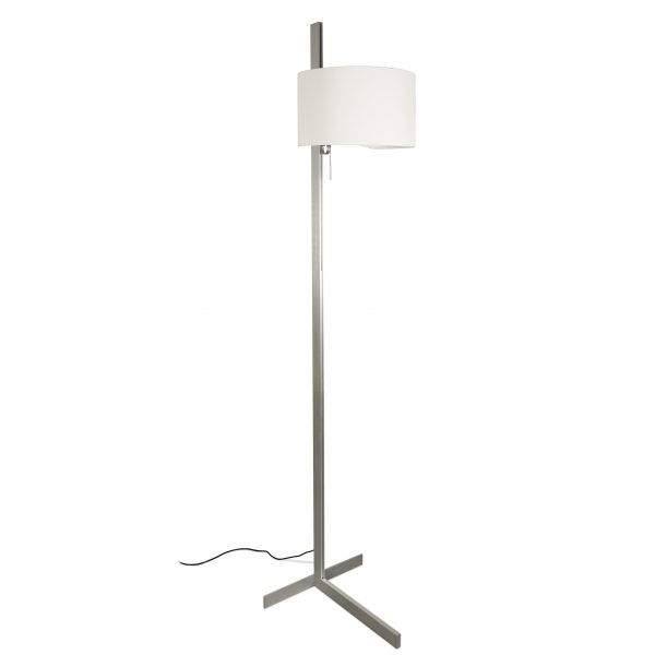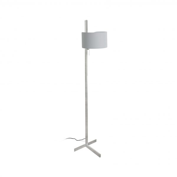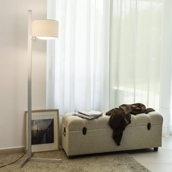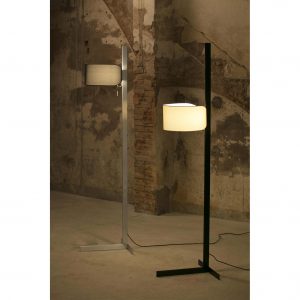 Lámpara de pie STAND UP. La lámpara de pie Stand Up es un pie de aluminio con estructura minimalista y base en forma de T. Es elegante y simple, que dispone de varias combinaciones: estructura de aluminio con pantalla en Blanco, gris o negro o estructura de aluminio lacado en negro con la misma disponibilidad de pantallas. Además tiene una peculiaridad, y es que la pantalla puede ser regulada en altura, lo que la hace muy versátil.