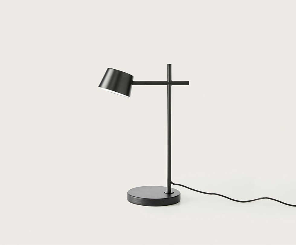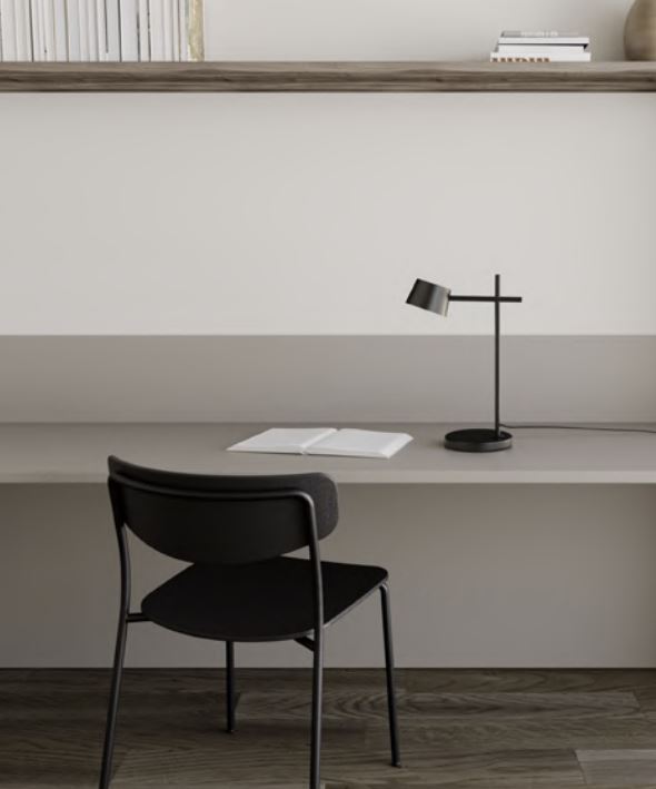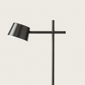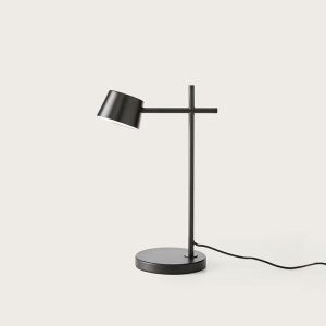 Lámpara de sobremesa Nera. La lámpara de sobremesa Nera es un elemento decorativo fino y delicado. Sus rotulas de acero negro mate en forma de T componen una luminaria sencilla adaptable a multitud de espacios. Como lámpara de escritorio o para la mesita del dormitorio.