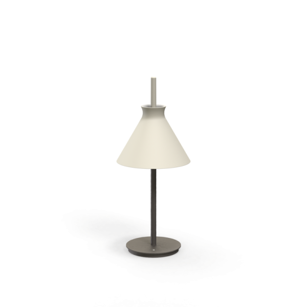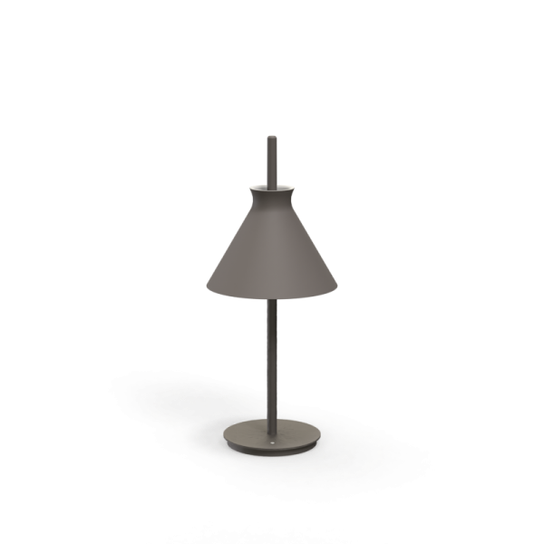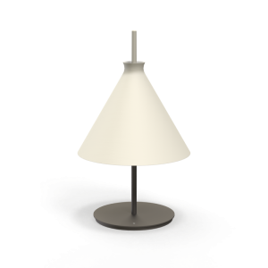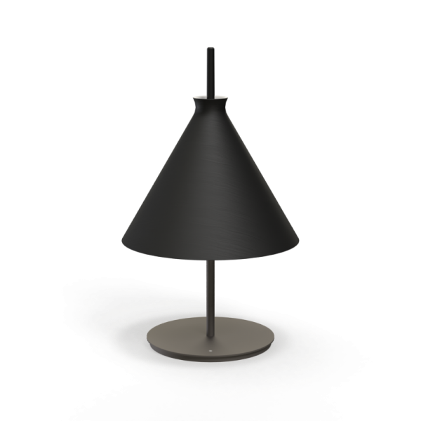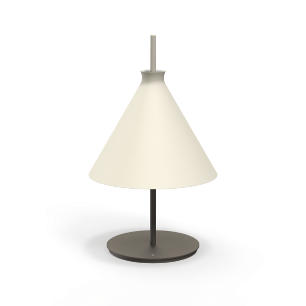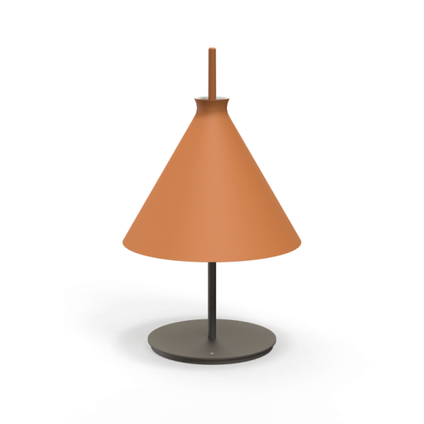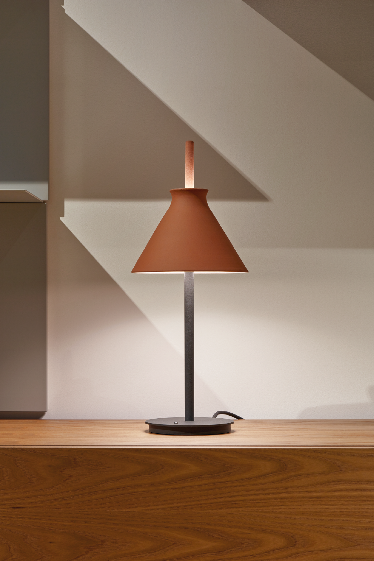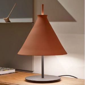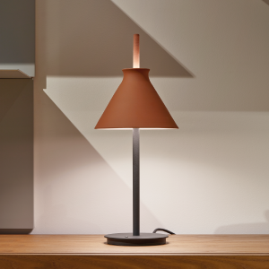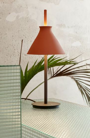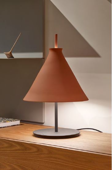 Lámpara de sobremesa Totana. La lámpara de sobremesa Totana es parte de una colección de luminarias inspirada en los orígenes geográficos de la marca POTT. Totana (Murcia-España) tiene paisaje de contrastes, tonalidades de barro, alfarería y sabiduría, luces y sobres, fuego y agua. Formada por dos volúmenes que se interseccionan. El primero envolvente, gestual, voluminoso, de forma cónica con una terminación superior que hace referencia a la boca de un envase cerámico torneado a mano; y el segundo lineal y estructural, definido como un trazo. Como resultado, una luminaria cálida en equilibrio entre la materialidad y la luz.