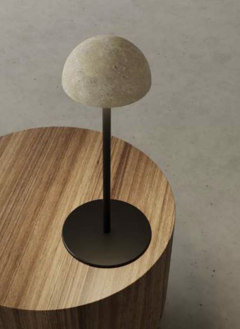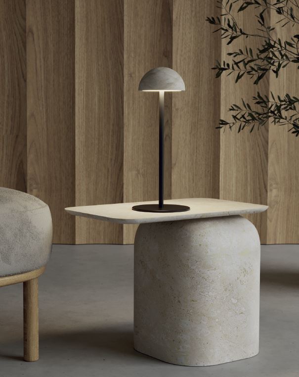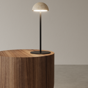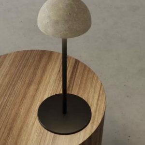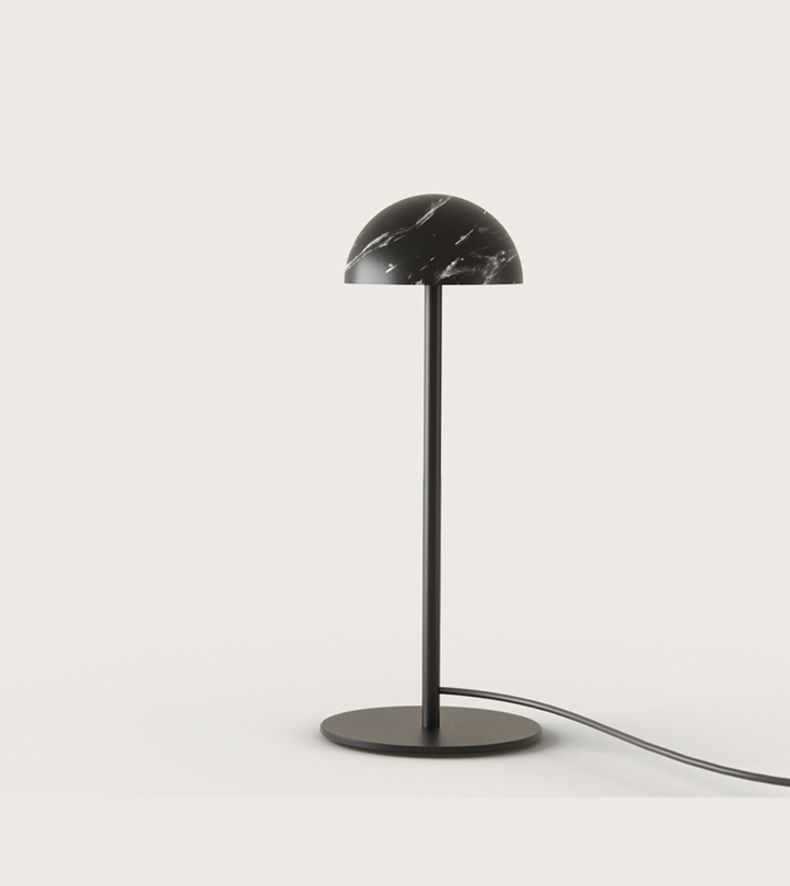 Lámpara sobremesa Dussa. La lámpara de sobremesa Dussa, fabricada en metal y mármol es la expresión de un diseño minimalista y simple. Una tulipa de mármol, disponible en varios colores, está sujeta por una pie fino de metal, también disponible en varios acabados.