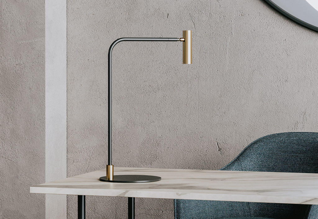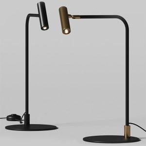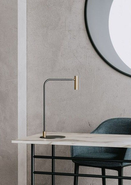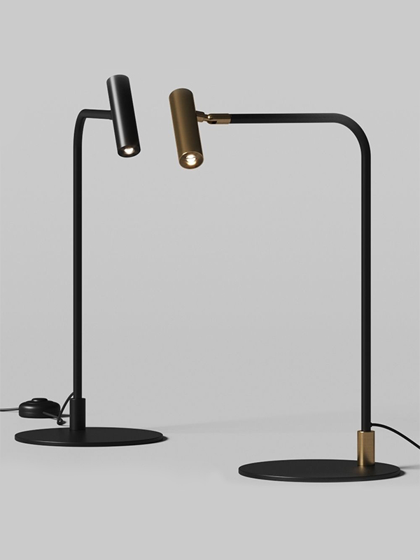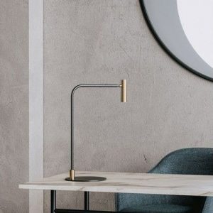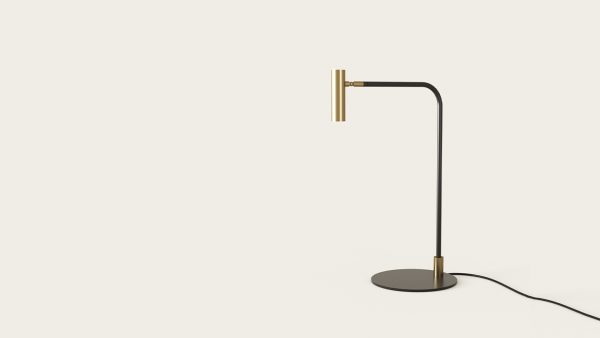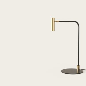 Lámpara de sobremesa Maho. La lámpara de sobremesa Maho es la expresión de la simplicidad y la no ostentación. Un rotula fina en negro mate sujeta un pequeño cabezal en oro mate o negro. Dirigible y con un rango de movimiento bastante amplio la hace ideal para rincones de lectura.